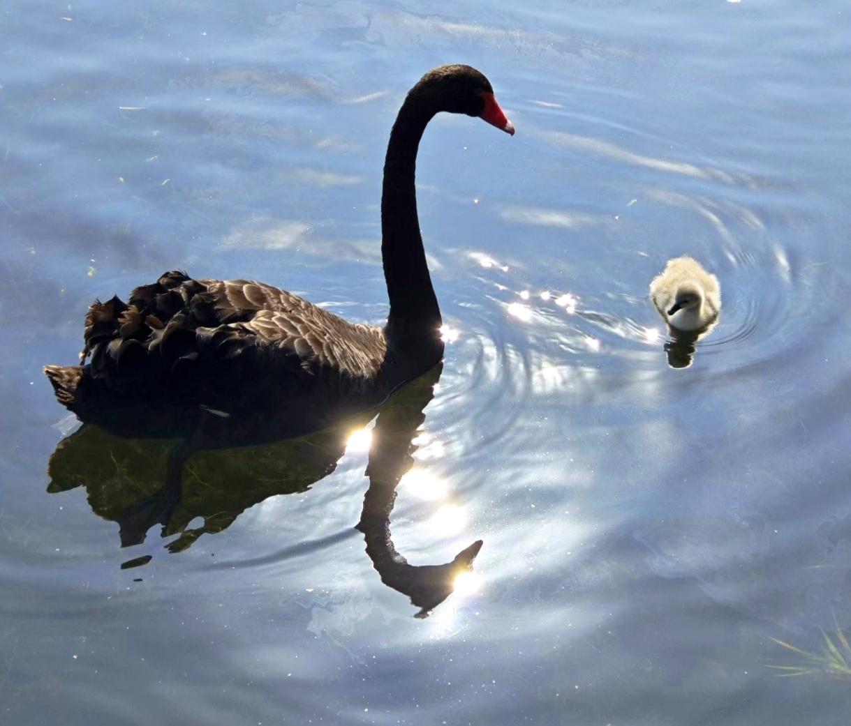 在朋友圈里看到的黑天鹅和丑小鸭,原来黑天鹅的小宝宝不是黑色的,照片经过美颜后就更漂亮了。