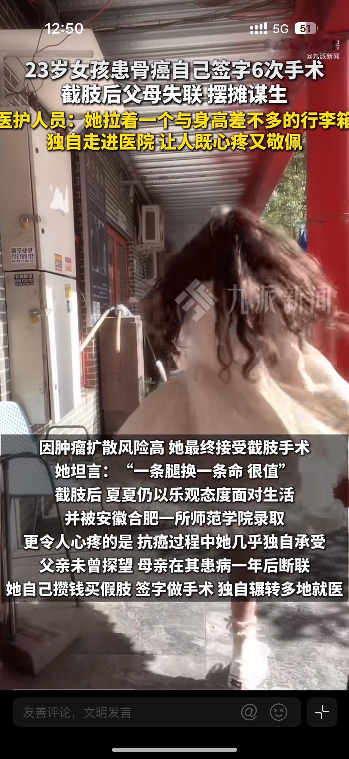 23岁安徽女孩夏夏把社交平台年龄改成100岁,背后是她独自对抗骨癌五年、截肢后父母失联的辛酸故事。这个笑着求大家说“公主请恢复健康”的姑娘,用最乐观的姿态扛下了最沉重的苦难,让无数网友又心疼又敬佩。 夏夏本是美术特长生,高考前右腿就疼得走不动路,却硬撑着进了考场,数学考试中途晕倒呕吐,醒了又接着答题。高考一结束,她就被确诊为骨肉瘤,也就是俗称的骨癌,这个病进展快、转移率高,医生说必须截肢才能保命。19岁的她独自签下手术同意书,失去了右腿,还轻描淡写地说“一条腿换一条命,值了”。可命运没放过她,癌症先后转移到肺部、胸膜和肋骨,五年来她一共经历了6次大手术、无数次化疗,每次都是自己跑医院、签字、住院,没人陪在身边。更让人寒心的是,父亲自她生病后就从没出现过,母亲在她患病一年后也断了联系,还留下一句“你是拖累”。为了凑医药费,她拖着假肢摆摊卖手工挂件,最多一天赚200元,少的时候连饭钱都不够,却从不愿主动求助,说不想消费自己的病情。 本该是享受青春、畅想未来的年纪,她却在医院和病床间挣扎,没有父母的疼爱,没有家人的依靠,所有的痛苦都得自己扛。化疗让她掉光头发、皮肤变黑,假肢磨得腿生疼,手术伤口疼到睡不着,可她视频里总带着笑,还把年龄改成100岁——这哪里是玩笑,分明是一个热爱生命的姑娘,对活下去最执着的许愿。比起病魔的折磨,父母的抛弃或许更让人心碎,可她没抱怨、没消沉,反而靠着自己的双手挣钱治病,用乐观感染着身边的人。 她知道抱怨没用,所以选择笑着面对;她不想麻烦别人,所以再难也自己扛;她渴望活下去,所以哪怕癌细胞一次次转移,也毫不犹豫地签下手术同意书。想想我们很多人,遇到一点小事就叫苦连天,可夏夏在绝境中还在努力发光,这份韧性太难得。她让我们明白,生命最动人的从来不是一帆风顺,而是在认清生活的残酷后,依然选择热爱生活。那些说她是“拖累”的家人,永远不懂他们放弃的是多么珍贵的宝贝,而无数素不相识的网友,却纷纷跑去她的评论区留言“公主请恢复健康”,用善意温暖着这个独自战斗的姑娘。 有人特意跑去买她的手工制品,有人给她捐款捐物,医护人员拼尽全力为她制定治疗方案,这些陌生人的善意,成了她对抗病魔的力量。这个23岁的姑娘,用自己的经历告诉我们,哪怕命运不公,哪怕孤立无援,只要不放弃,就有希望。你看,她都没向命运低头,我们又有什么理由抱怨生活呢? 你有没有被夏夏的乐观和坚强打动?如果遇到她,你想对她说句什么?或者你身边也有这样在困境中依然积极生活的人吗?欢迎在评论区分享你的感受和故事。 来源:九派新闻