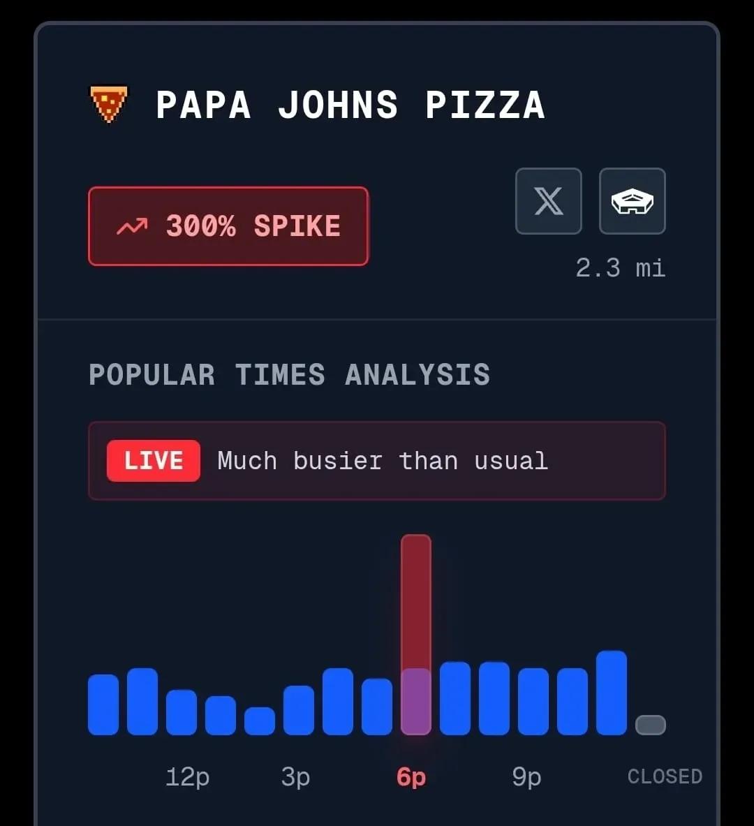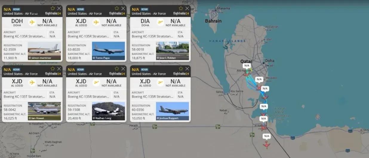 转自驻美记者王冰汝!特朗普是否会对伊朗发动袭击?媒体们都在寻找蛛丝马迹: 1航班追踪网站 Flightradar24 称伊朗已关闭其空域,除非获得许可,否则所有航班不得通行;仅允许获准的往返伊朗的国际航班飞行。 2 美国空军已开始从卡塔尔的乌代德空军基地撤离军用飞机,为可能对伊朗发动打击做准备。航班追踪显示,至少已有 6架 KC-135R/T加油机持续从该基地起飞离开。 3五角大楼披萨指数14号六点开始暴增 4白宫行政大楼停车上夜间仍然是“客满”,暗示白宫今天处于加班状态。