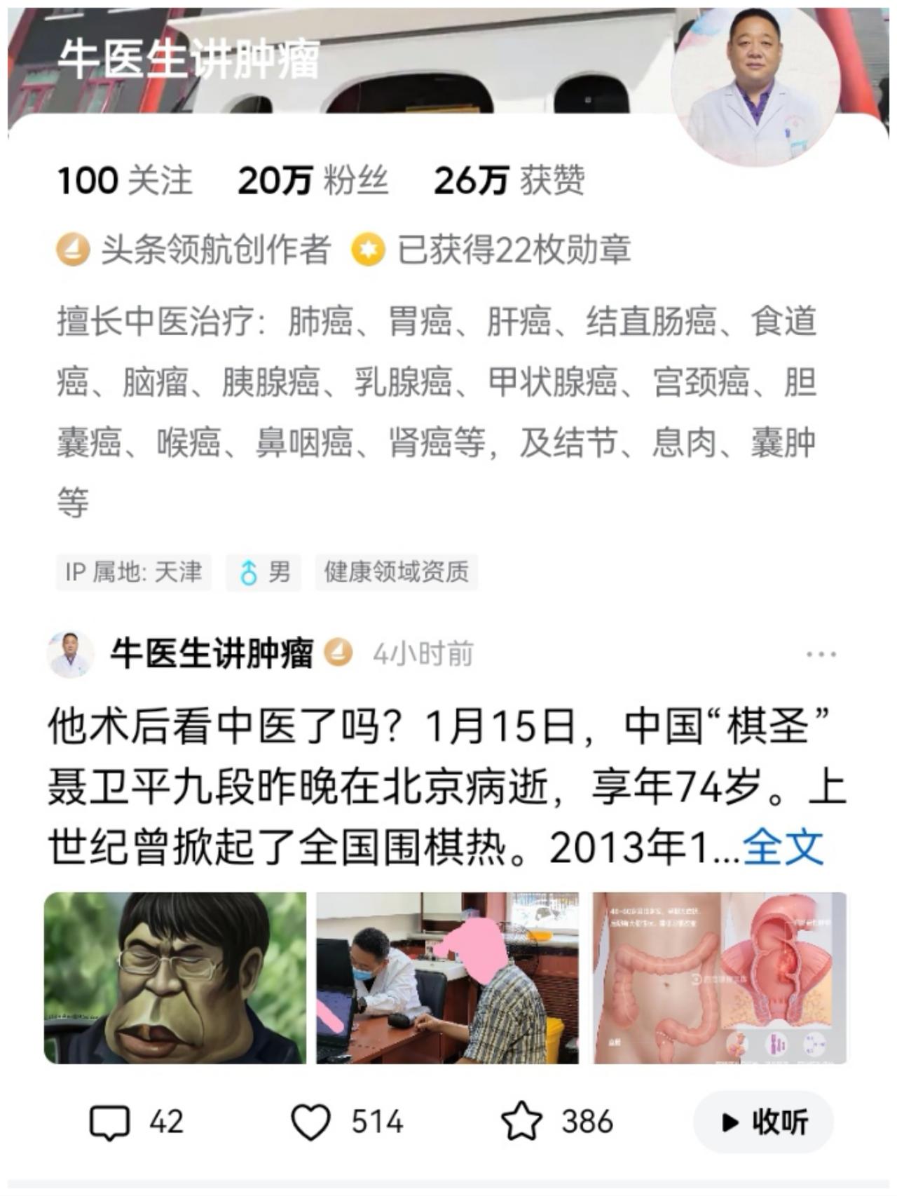 牛医生这图有点不太礼貌了吧!? 就这还有500+的点赞,20万粉呢? 聂老刚离世,就用丑化图片博眼球?借着逝者的热度博关注,连最基本的对逝者的尊重都没有了吗? 聂老为中国围棋立下的功绩,值得所有人敬重,拿逝者消费、用低俗配图博流量,这种吃相真的太难看了! “牛医生讲肿瘤”,头条的领航创作者,你擅长不擅长中医治疗,咱不知道,但是自古做事先做人! 我个人觉得这种消费逝者的行为应该被大家全网抵制!大家觉得应该让平台该对这类博主做出处罚吗?