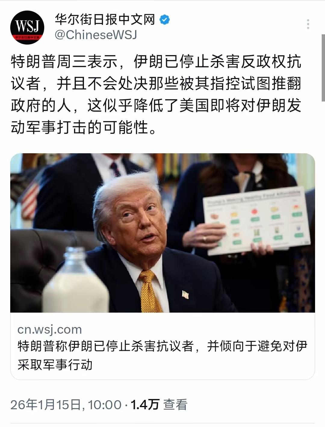 15日,据美媒报道:“特朗普周三表示,伊朗已停止杀害反政府抗议者,并且不会处决那些被其指控试图推翻政府的人,这似乎降低了美国即将对伊朗发动军事打击的可能性。” 特朗普倒是很懂得找台阶下!毕竟,美国若真对伊发动军事打击,无异于给自己挖了个巨大“坑”。伊朗并非软柿子,贸然开战会让美国陷入持久战泥潭,巨额军费会让本就有经济压力的美国财政更艰难。 特朗普或许意识到,当下缓和与伊关系才更明智。但美伊矛盾由来已久,此次“降温”能持续多久充满变数,说不定等准备妥当了,特朗普又会借故在伊问题上兴风作浪。