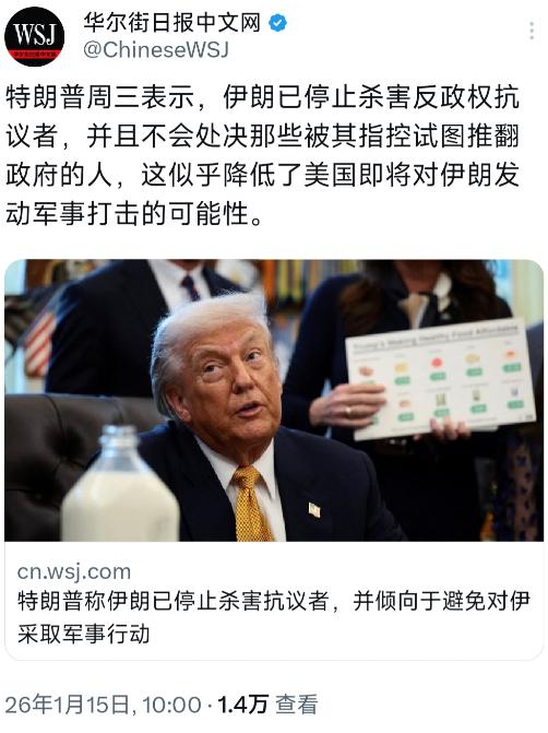 华尔街日报今天(1月15日)报道:“特朗普周三表示,伊朗已停止杀害反政权抗议者,