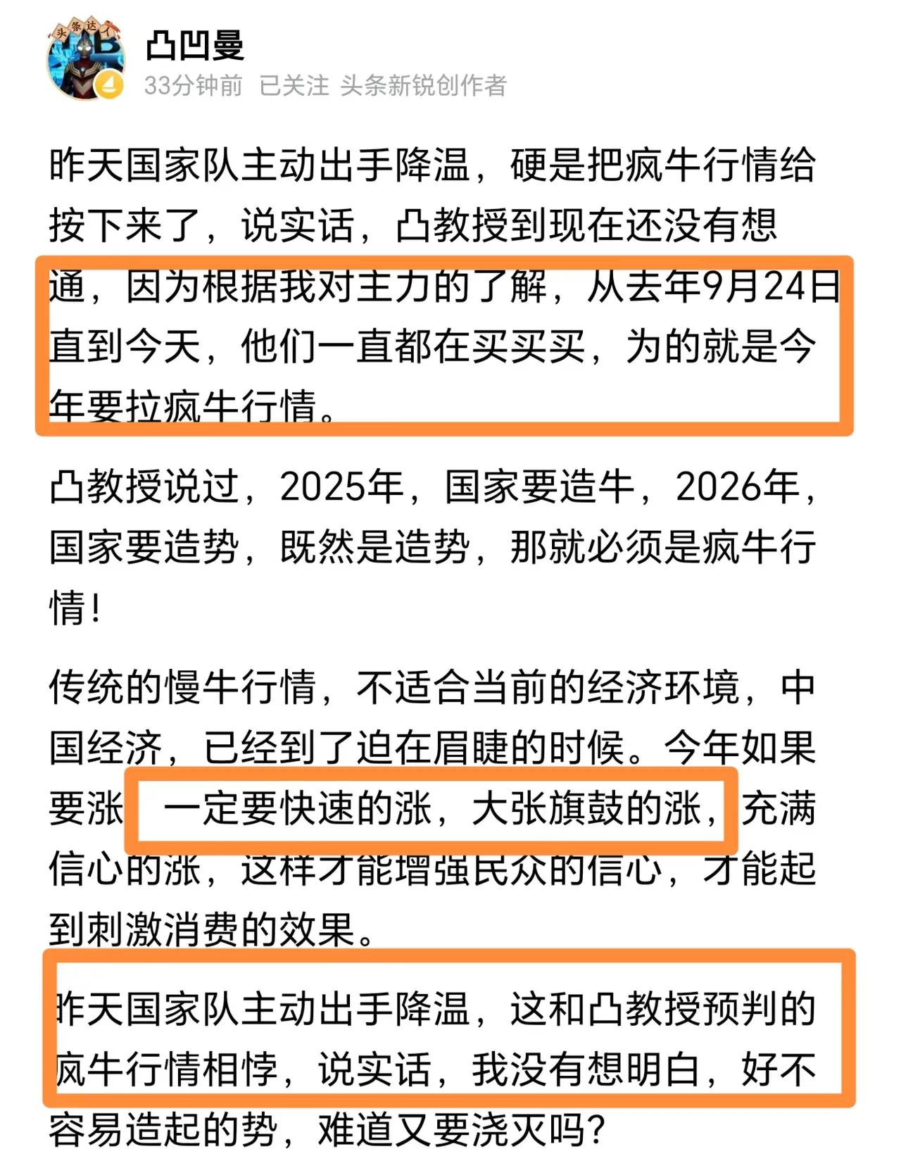 昨天我就给凸教授留言:如果你再鼓吹疯牛、追求暴富,估计很快要被关小黑屋! 今天的盘面表明,疯牛即将被制服;但老凸中午和收盘后的文章表明,他不仅不理解为什么要给疯牛治未病,还在鼓吹造势,歇斯底里重复:“何以解忧,唯有暴富!” 大伙说,这对着干的老凸头条,该不该进黑屋?