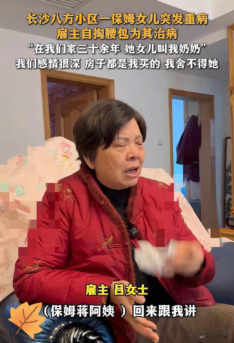 破防了!长沙八方小区一雇主得知保姆,准备放弃重病的18岁女儿时,直接放话:“你要是敢不救,我就把你赶出去 保姆女儿航航病危急需30万手术费,蒋妈妈绝望之下动了放弃的念头,雇主吕阿姨当场急红了眼“逼”她:“你敢不救,我就把你赶出去!钱的事我来扛!” 三十年前,蒋妈妈孤身来吕阿姨家做工,一干就是半辈子。吕阿姨看着航航从蹒跚学步的小不点长成18岁姑娘,早就把她当成亲孙女疼,不仅常年帮衬母女俩的生活,还为她们在长沙买了房。 如今孩子躺在病床上,她更是倾其所有,跑前跑后对接医生、办理手续,比照顾自家孩子还要上心! 这哪是简单的雇主援手,分明是三十年真心相待攒下的人间至情!血缘从来不是家人的唯一凭证,危难时的挺身而出、岁月里的温暖相伴,才是最牢不可破的羁绊! ​​这样的人间大爱,值得我们所有人点赞!