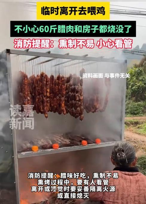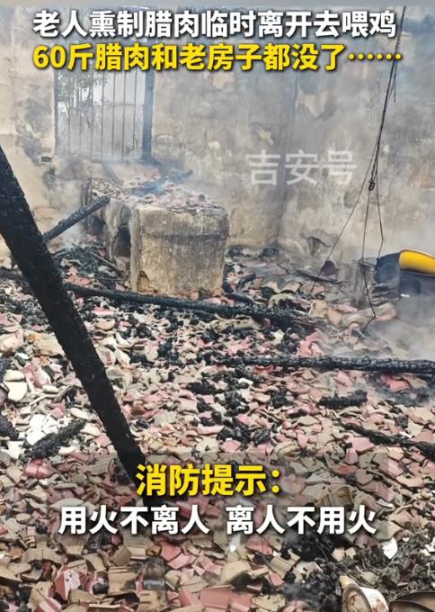 “短短几分钟酿成了悲剧!”近日,江西,一老人在家熏腊肉,刚将60斤腊肉放好,又临时离开去喂鸡,短短几分钟,明火引燃易燃物,等老人回来,满屋腊肉化为灰烬,房子也被烧得面目全非!网友:年关将至,熏腊味千万不能离人! 熏腊肉是不少地方过年的传统习俗,家家户户都会提前准备,可这份年味背后,却藏着不小的火灾隐患。江西这位老人的经历,就给所有人敲响了警钟。 据媒体1月14日报道,临近年关,老人想着熏制腊肉备年货,便在家中生火开始熏烤,满满当当的60斤腊肉挂在火上,香味渐渐飘了出来。中途老人想起院子里的鸡还没喂,想着只是离开一小会儿,不会出什么问题,于是便随手关上门去了院子。 可就是这短短几分钟,意外发生了。熏腊肉的明火引燃了旁边的易燃物,火势迅速蔓延开来,很快就吞噬了熏肉的区域,然后烧向房屋。等老人喂完鸡回来,看到的已是漫天火光,滚滚浓烟从屋里冒出来,60斤腊肉早已被大火吞没,房屋也被烧得面目全非。 老人慌忙呼救,邻居们赶来帮忙灭火,可火势已经失控,直到消防人员赶到,才将大火彻底扑灭。看着被烧得精光的房子和腊肉,老人心疼得直掉眼泪,辛苦了大半年准备的年货没了,连住的地方也没了。 消防人员提醒,年关前后用火、用电、用气的频率增高,消防安全绝不能掉以轻心。无论是熏制腊肉,还是日常用火,都要做到人不离火、火不离人,避免因一时疏忽引发火灾,造成不可挽回的损失。 信息来源:《老人在家中熏腊肉,临时离开去喂鸡,不小心60斤腊肉和房子都烧没了,消防提醒:熏制不易小心看管。