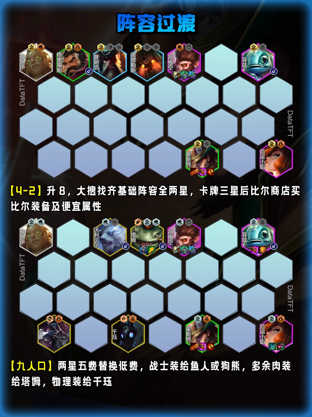 ✅九人口:用两星五费替换低费卡,战士装给鱼人/狗熊,肉装给塔姆,物理装甩给千珏