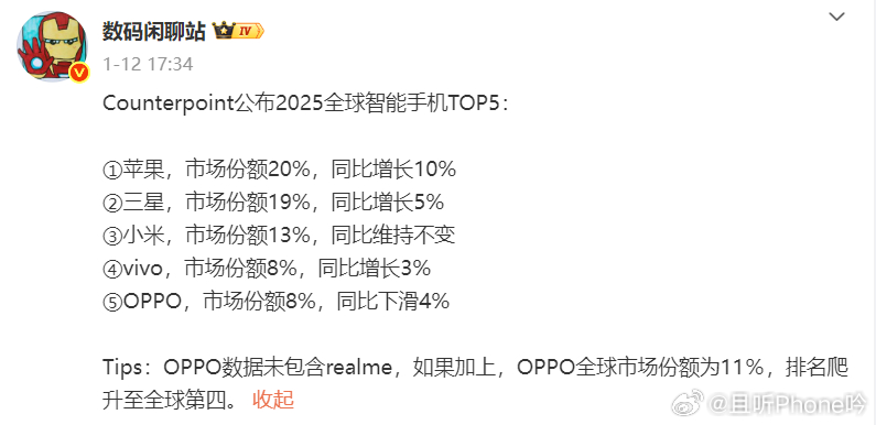 2025全球手机排行榜出炉 苹果三星依然是前二,而且领先很多,还都是同比增长。虽然这俩品牌在国内不能说多好用,但是品牌力和综合实力还是很强的。国产品牌米VO分列三到五,小米占总销量13%,第三还是挺稳的。蓝绿厂差不太多,都属于上升趋势,蓝厂同比增长3%,绿厂加上真我应该还能往走,看看今年的表现。苹果创历史最高出货量