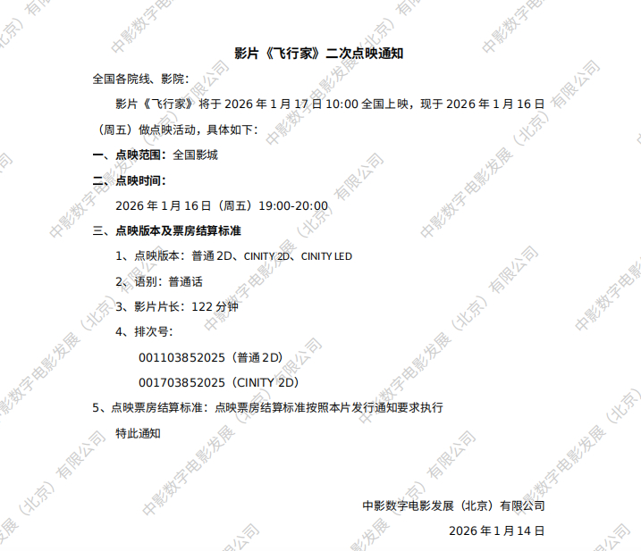 飞行家16日晚提前一天全国点映。