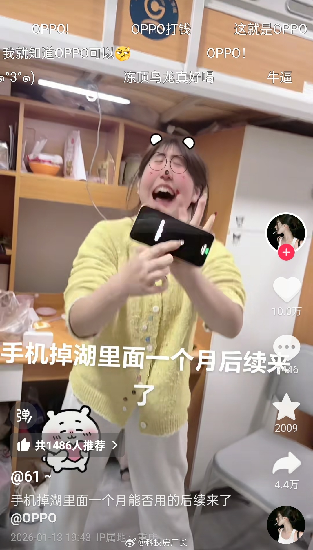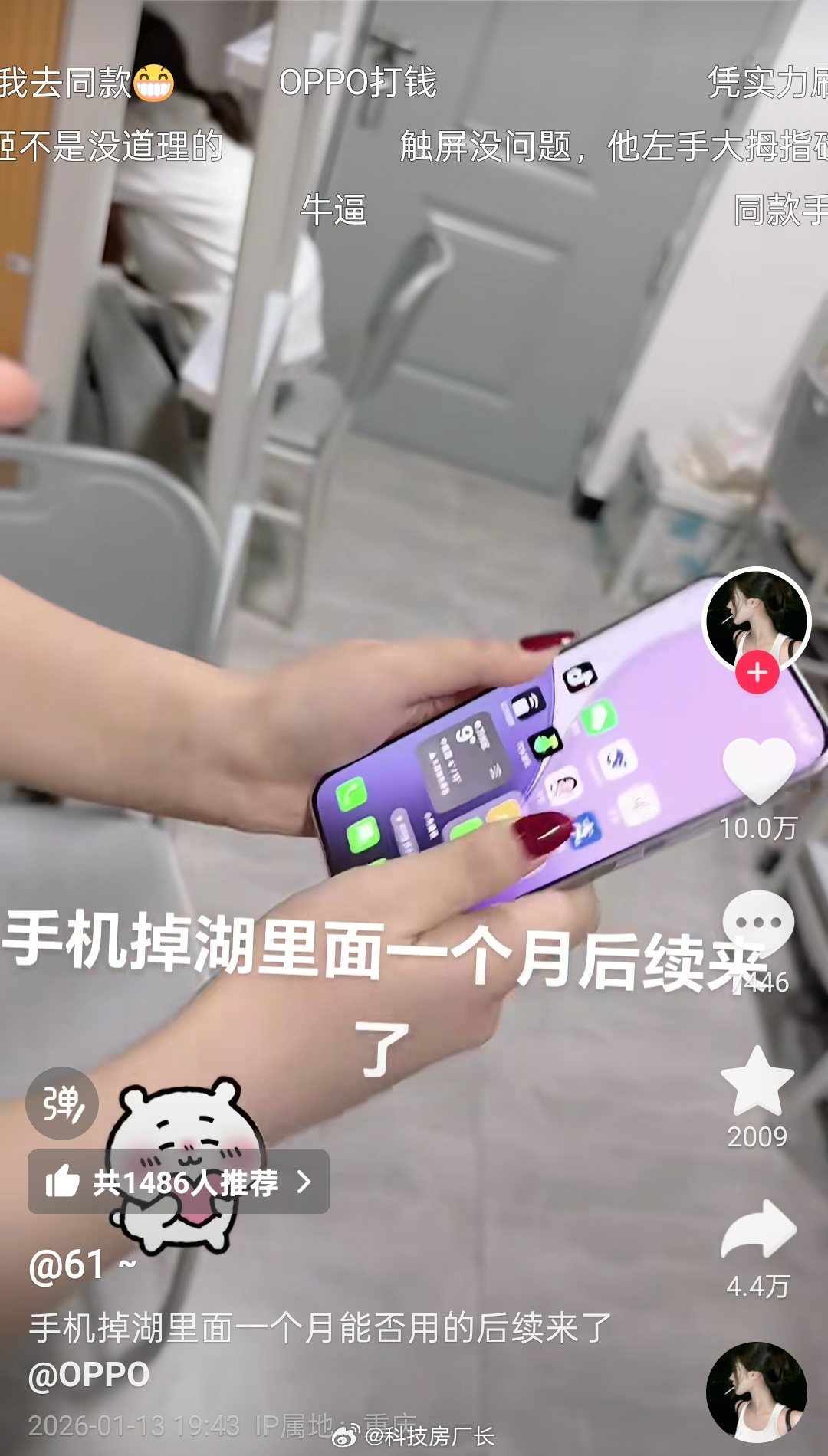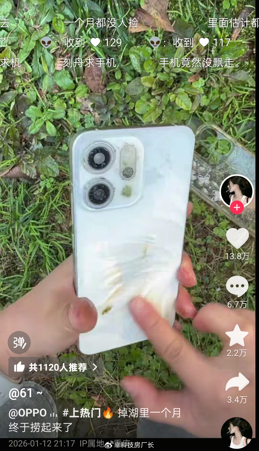 OPPO开年最好的广告来了,妹子的OPPO Reno 14掉湖里一个月,捞上来手机都长水藻了,没想到还能正常开机使用,满级防水就是强啊,网友都说人鱼姬在湖里游了一个月🧜♀️