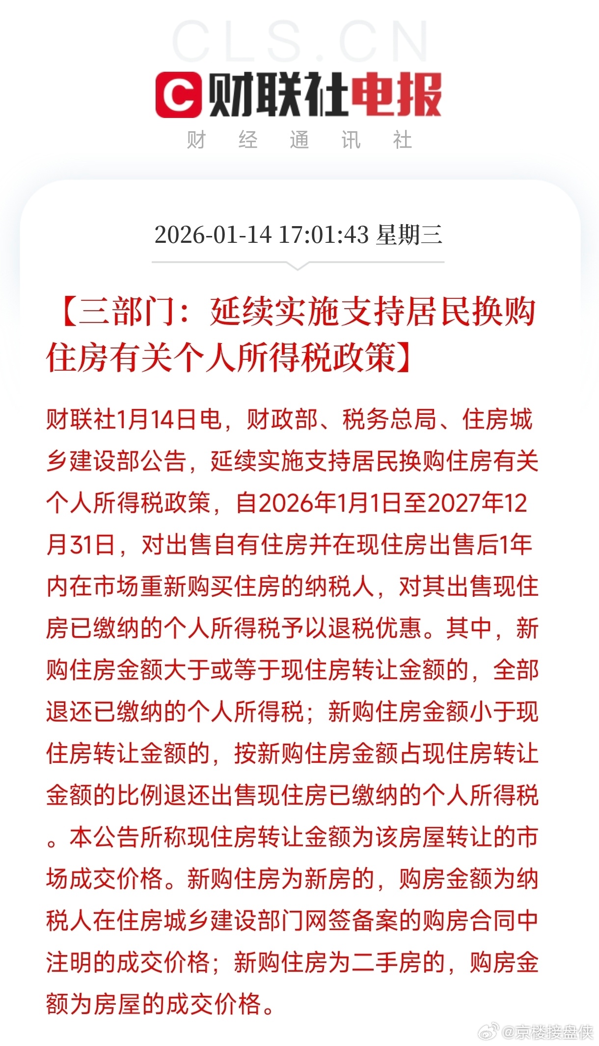 个税退税政策延续自2026年1月1日至2027年12月31日,对出售自有住房并在现住房出售后1年内在市场重新购买住房的纳税人,对其出售现住房已缴纳的个人所得税予以退税优惠。房地产政策市场利好政策