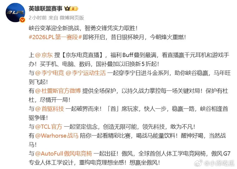 瘦死的骆驼是真快瘦死了...翻到19年的LPL赞助商对比今年真是豪华眼看他起高楼,眼看他宴宾客,,大伙也是见证过一个赛事的浮沉历史了2026LPL 英雄联盟S16 英雄联盟
