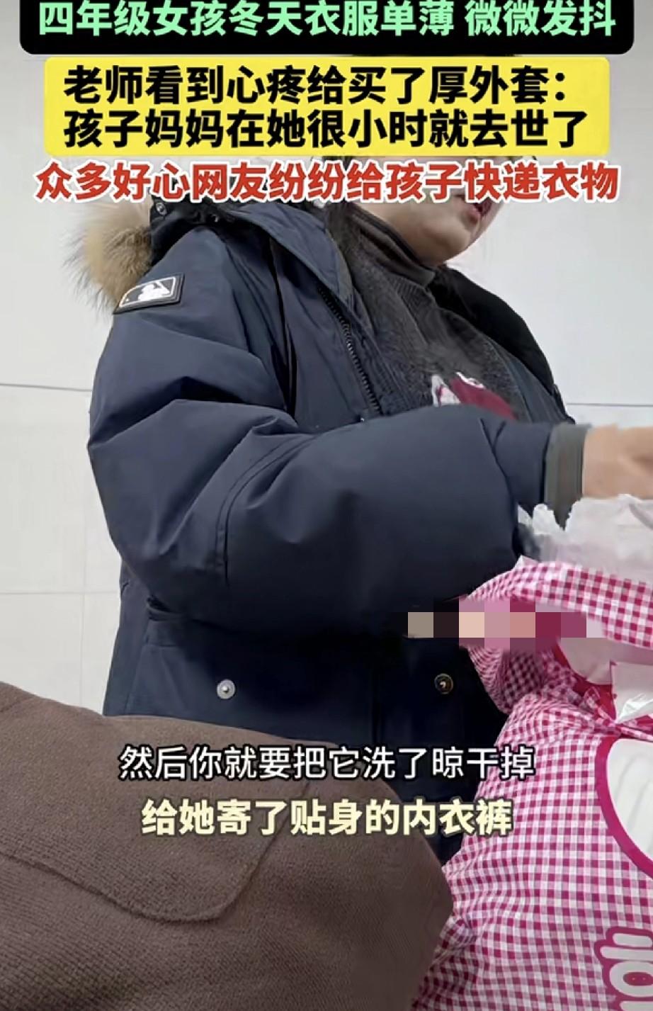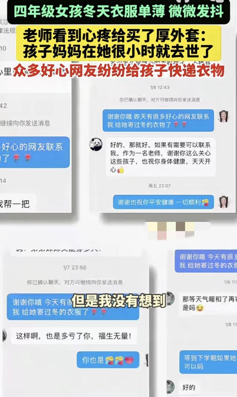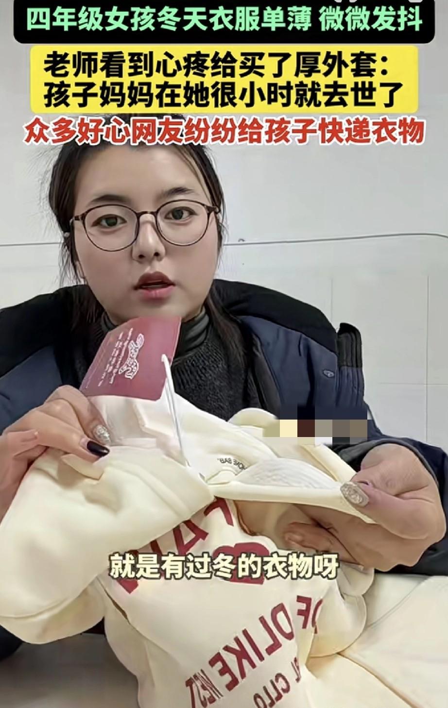 云南老师一个举动, 引发全网爱心潮, 真相让人鼻酸。 最近云南一位小学英语老师,看到班上四年级的一个女生,下雪天还穿着很薄的衣服来上学。 在食堂吃饭时,孩子冻得直发抖,老师心里特别难受。 后来她才知道,这小女孩妈妈早就不在了,家里情况挺难的。 老师心疼她,就自掏腰包买了厚外套,还拍了照片发到网上说了这事。 没想到视频一下火了,全国各地的好心网友开始往学校寄包裹。 衣服、鞋子、书包、文具,啥都有。 连内衣裤都有人专门买来寄来,还有人说要资助她读完书。 东西太多,一个孩子实在用不完。 老师跟寄东西的网友沟通后,把多余的衣服分给了班上另外两个家里困难的孩子。 现在三个孩子都穿得暖暖的,脸上也有笑容了。 老师说,没想到自己一件小事,能引来这么多善意。 那些包裹里装的不只是衣服,是一个个陌生人的心意。