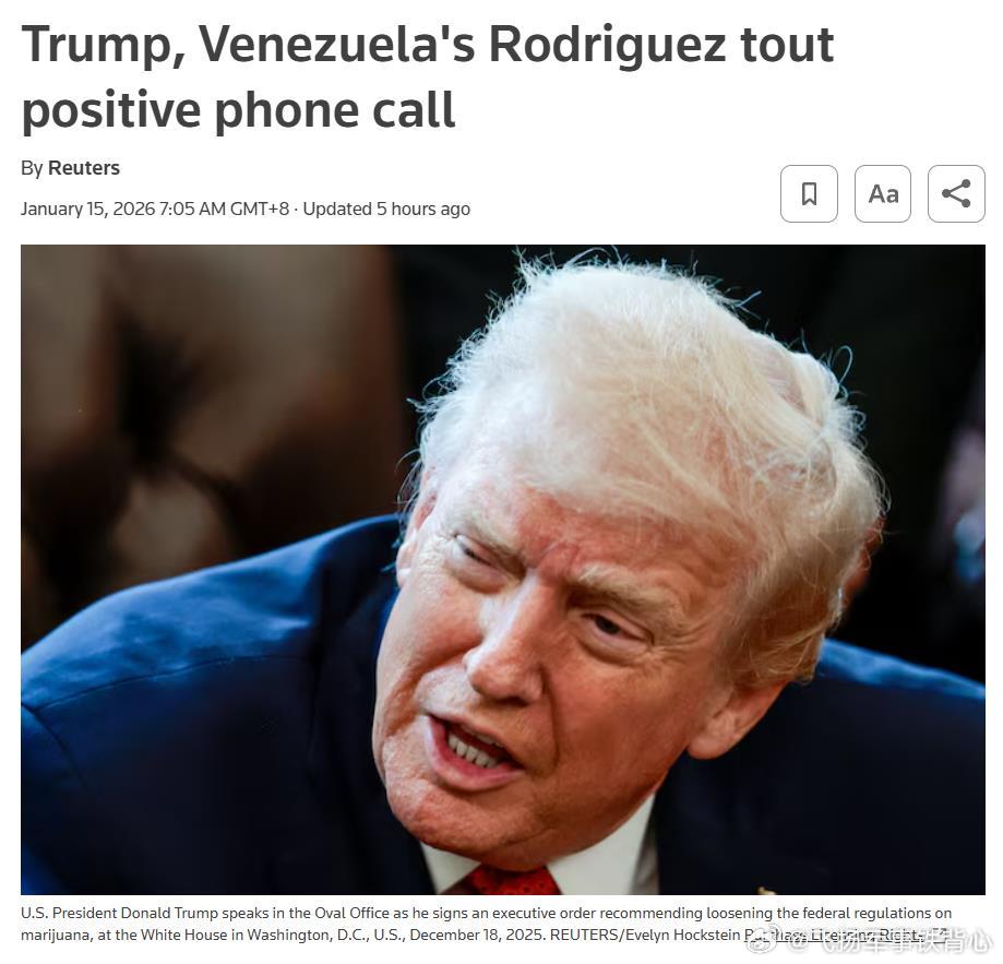 特朗普的帖子:今天早晨,我与委内瑞拉代理总统德尔西·罗德里格斯通了非常好的电话。我们取得了巨大的进展,正在帮助委内瑞拉实现稳定与复苏。我们讨论了很多议题,包括石油、矿产、贸易,当然还有国家安全。美利坚合众国与委内瑞拉之间的这种伙伴关系,将对所有人来说都是非凡的合作。委内瑞拉很快将再次变得伟大而繁荣,或许比以往任何时候都更加强盛!烽火问鼎计划