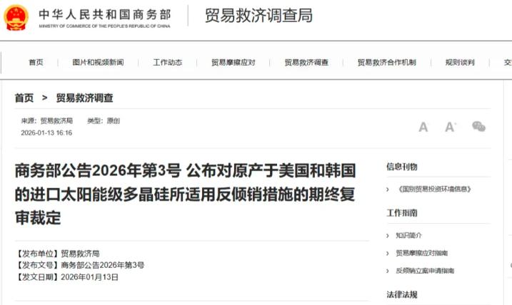 既然有人想掀桌子,干脆把门也给关了 【新华网】新华社北京1月10日电 商务部10日发布公告,决定自2025年1月14日起,对原产于美国和韩国的进口太阳能级多晶硅所适用的反倾销措施进行期终复审调查。 根据商务部建议,国务院关税税则委员会决定,在反倾销措施期终复审调查期间,对原产于美国和韩国的进口太阳能级多晶硅继续按照商务部2014年第5号公告、2017年第78号公告和2020年第1和21号公告公布的征税产品范围和税率征收反倾销税。 被调查产品主要用于太阳能级单晶硅棒和定向凝固多晶硅锭的生产,是生产晶体硅光伏电池的主要原料。 看看这税率,韩国部分企业的税率直接顶格到了113.8%,美国的税率也是在53.3%以上。这意味着这两国的相关产品基本上告别中国市场了。这就是我们常说的,你要打贸易战,我们就打保卫战,而且是精准打击,打到你痛处。 这就不得不提一段往事。早在十几年前,也就是2011年左右,那时候中国的光伏产业刚刚起步。美国和韩国的企业仗着技术优势和成本控制,向中国大量低价倾销多晶硅。那时候他们是想趁着中国产业还未成熟,直接用低价把中国的国产企业扼杀在摇篮里。2013年的时候,韩国向中国出口了2万多吨多晶硅,占了咱们进口总量的四分之一还多。这不仅仅是做生意,这是在抢占定价权。 当时中国政府果断出手,2014年就开始征收反倾销税。这一晃十几年过去了,现在的形势完全变了。中国已经成了全球光伏产业的绝对霸主。但为什么还要继续征税?是不是多此一举?当然不是。这次的期终复审调查结果显示,如果取消征税,这些外国企业极有可能卷土重来,继续搞倾销。咱们好不容易把产业做大做强,把饭碗端在了自己手里,绝不能让外人再把桌子掀了。 在这个关口,韩国其实挺尴尬的。它一直是美国的盟友,但在经济上又高度依赖中国市场。这次美国搞单边主义制裁,韩国作为盟友并没有得到豁免,反而因为跟随美国的步伐,在贸易上吃了瓜落。那些韩国大企业在新能源领域投入巨大,本来指望中国这个大市场回血,现在税率一加,竞争力全无。 这其实给很多国家提了个醒,跟在美国后面搞单边霸凌,最后受伤的往往是自己。 我们必须看清一个现实,现在的国际贸易环境确实很复杂。美国那边想利用关税工具来重塑全球供应链,甚至不惜破坏既有的规则。他们觉得只要加税,制造业就会回流,别国就会屈服。但实际情况往往是,关税壁垒只会增加自身的成本,最后由本国消费者买单。反观中国,这次迅速出台的第3号公告,展现的是一种战略定力。不管是面对美国的直接施压,还是面对其盟友的间接配合,我们的态度始终如一:打,奉陪到底;谈,大门敞开。 那这对我们国内产业有什么影响?影响大了去了。2025年前三个季度,多晶硅进口量同比下降了一半以上,这说明国内产能完全跟得上,而且质量更好。通过反倾销措施,我们屏蔽了外部的恶意低价竞争,给国内企业创造了一个公平的发展环境。这就是国家在背后撑腰,让企业能安心搞研发、搞生产。 回顾这一轮博弈,既有外交层面的严正表态,又有商务层面的雷霆手段。那种“报复不隔夜”的高效,其实反映的是国家治理能力的提升。我们不再是那个被动挨打的角色,手里有了更多的牌,也有了更足的底气。对于美国那位喜欢搞“极限施压”的领导人来说,他可能需要适应一个新的现实:今天的中国,不会再吞下任何损害自身正当利益的苦果。至于那些想在中美博弈中浑水摸鱼或者拉偏架的国家,恐怕也得好好掂量掂量了。毕竟,生意是做出来的,不是靠政治站队站出来的。