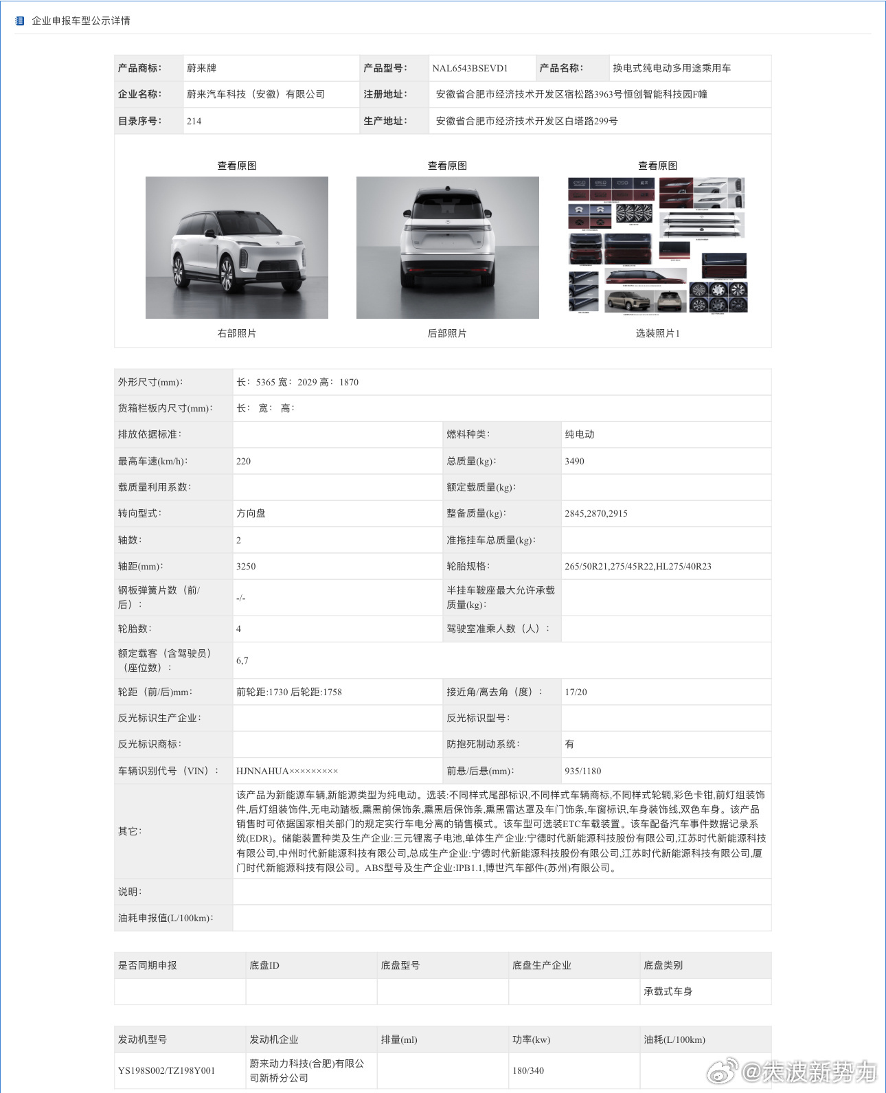 蔚来ES9国产最大SUV现身工信部备案, 这个尺寸应该叫合肥领航员吧! 庞然巨物! 蔚来es9工信部曝光