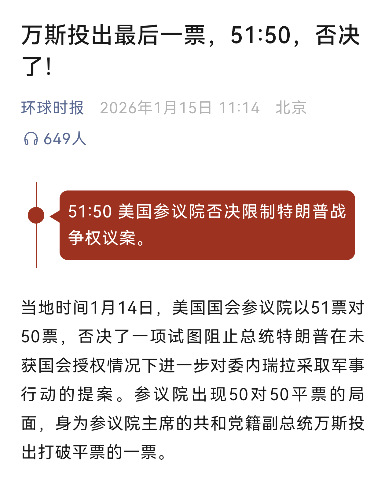 其实这个法案就是演戏给世界看,表示特朗普的侵略行为不是没阻止,而是“阻止不了”。票都投过了,没用美国这个国家是人类历史上最会粉饰自己穷兵黩武的战争贩子,也是最能找莫须有的理由和借口的侵略者。伊朗宣布暂时关闭领空美国已开始出售委内瑞拉石油美国向中东地区调遣航母打击群
