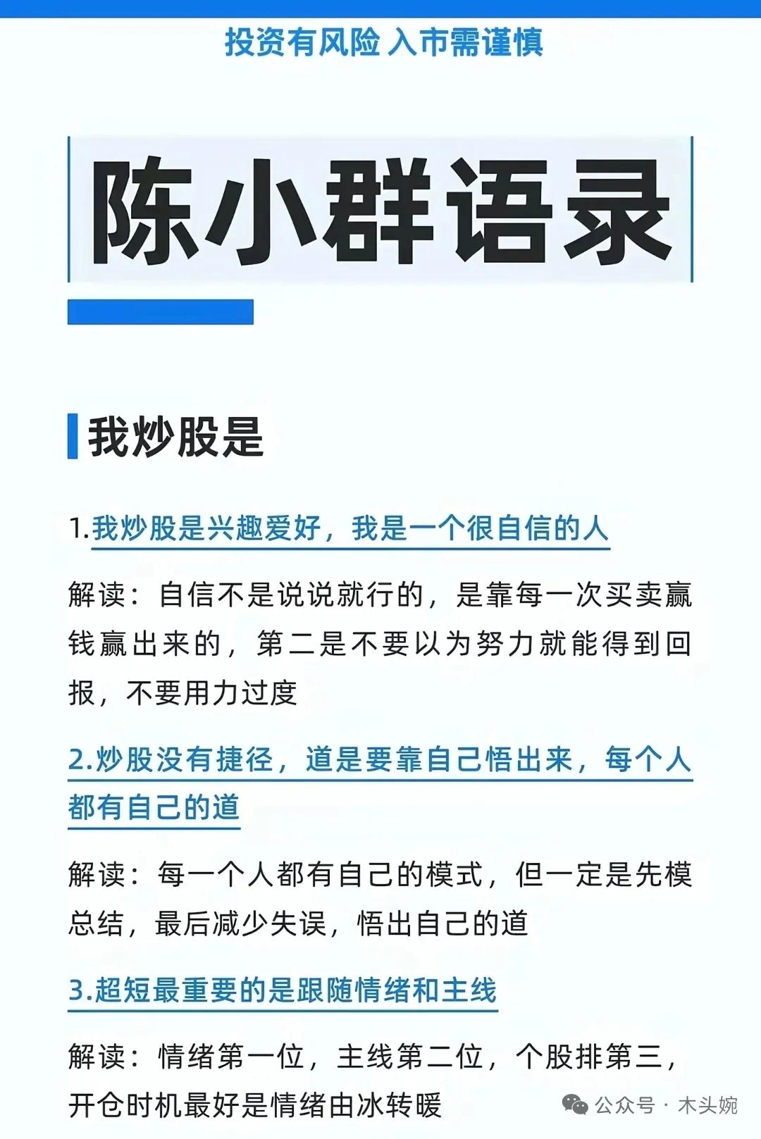 陈小群超短交易语录干货整理!从情绪主线把握、龙头战法实操,到仓位控制与交易认知,24条核心要点搭配深度解读,把超短交易的底层逻辑和实操技巧讲得明明白白,堪称超短交易的实战心法~ 顶级游资 股票陈小群 陈小群概念火了,1月15日华胜天成集合竞价后涨停封单一度超过534万手。陈小群是A股新生代顶级游资,以情绪合力龙头战法闻名,2018年30万本金起步,2025年资金规模达近10亿。 陈小群经典语录集合整理:超短最重要的是跟随情绪和主线!龙头能带动板块才叫真龙头,上板必须带出跟风赚钱效应;不干杂毛,做龙头或者潜在龙头,没地位不想做;炒股本身简单,难得是如何克服心里的恐惧……