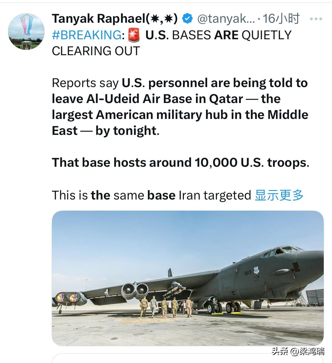 突发新闻: 卡塔尔美军基地正在悄悄撤离 有报道称,美国人员被告知今晚之前必须离开位于卡塔尔的乌代德空军基地——这是美国在中东最大的军事基地。 该基地驻扎着约1万名美军士兵。