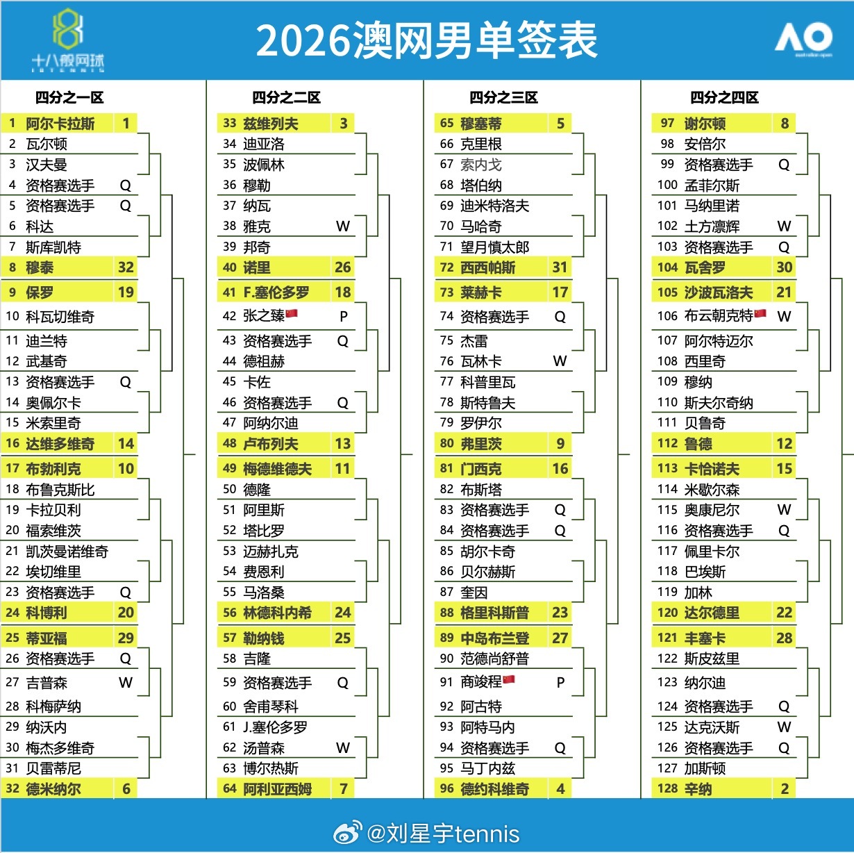 澳网20262026澳网 男单中文签表~~~