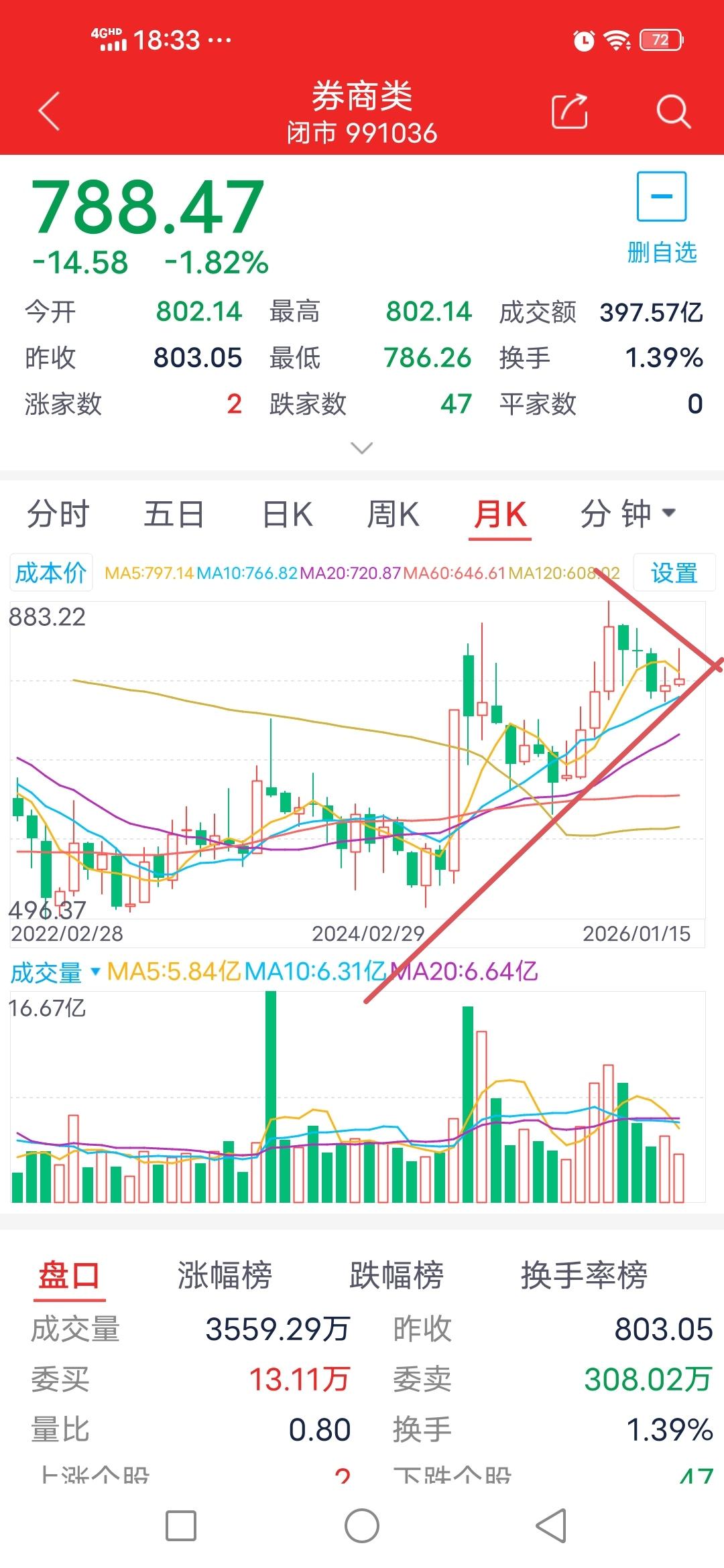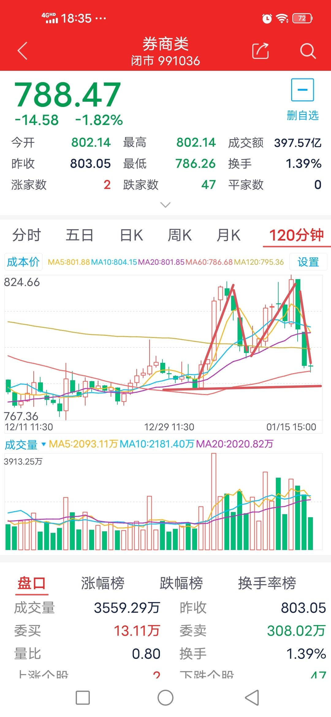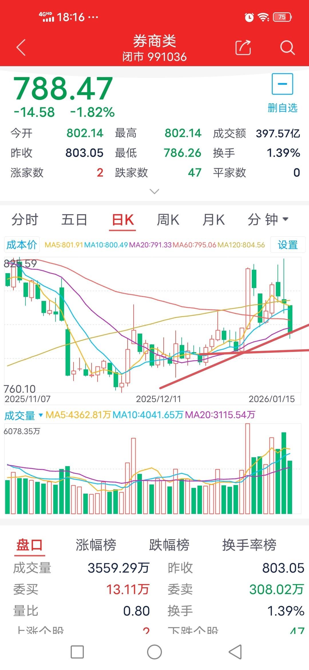 一阴穿五线!1月16日周五券商板块走势将如何? 今日券商板块开盘于802.14点,此乃全天最高点,最低下探至786.24点,最终收于788.47点,跌幅达1.82%。量能较昨日大幅缩减。 60分钟与120分钟级别,构建出一个M形顶部结构,若跌破779点的颈线位,便会持续向下调整,探寻新的底部支撑。 从日线级别而言,今日呈现一阴穿五线态势,5日线、10日线、20日线、60日线和120日线均被跌破,最终收盘价处于上升低点的连线处。 周线级别上,受20周线压力制约,暂时守住5周线和10周线。从走势分析,有形成收敛三角形的初步迹象,向上有高点连线压制,向下有低点连线支撑。 月线级别并无变化,依旧处于收敛三角形形态。 综合分析,明日早盘仍有继续下行的可能,将测试779点的支撑力度,向上压力位为20日线。