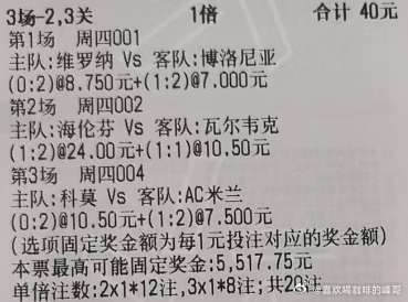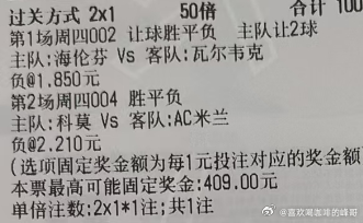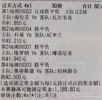 :001 意甲 维罗纳vs博洛尼亚博洛尼亚-0.25 负 0-2 1-2002 荷兰 杯海伦芬vs瓦尔韦克瓦尔韦克+1.5 让负 1-2 1-1003 德甲 奥格斯堡vs柏林联合奥格斯堡0 胜 1-0 2-0004 意甲 科莫vsAC米兰AC米兰-0.25 负 0-2 1-22串:002让负 004负4串:002让负 004负 001负 003胜成绩串:001(0-2 1-2)002(1-2 1-1)004(0-2 1-2)