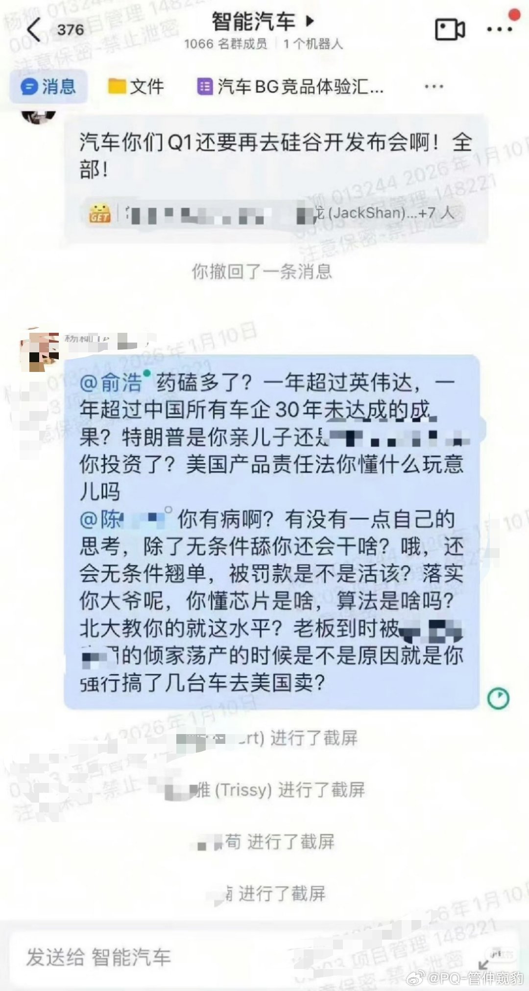 追觅员工怒怼CEO俞浩【脚踏实地,仰望星空】同样重要药磕多了?一年超过英伟达,一年超过中国所有车企30年未达成的成果?特朗普是你亲儿子还是xxx你投资了?美国产品责任法你懂什么玩意儿吗?你有病啊?有没有一点自己的思考,除了无条件舔你还会干啥?哦,还会无条件翘单,被罚款是不是活该?落实你大爷呢,你懂芯片是啥,算法是啥吗?北大教你的就这水平?老板到时被xx的倾家荡产的时候是不是原因就是你行搞了几台车去美国卖?