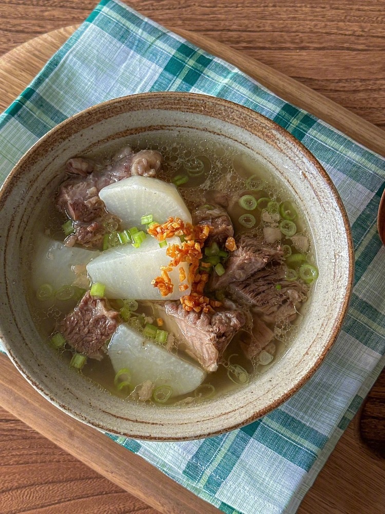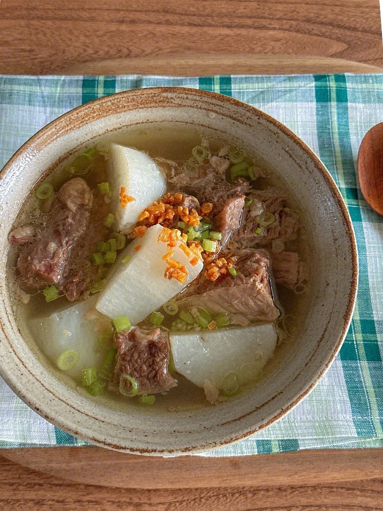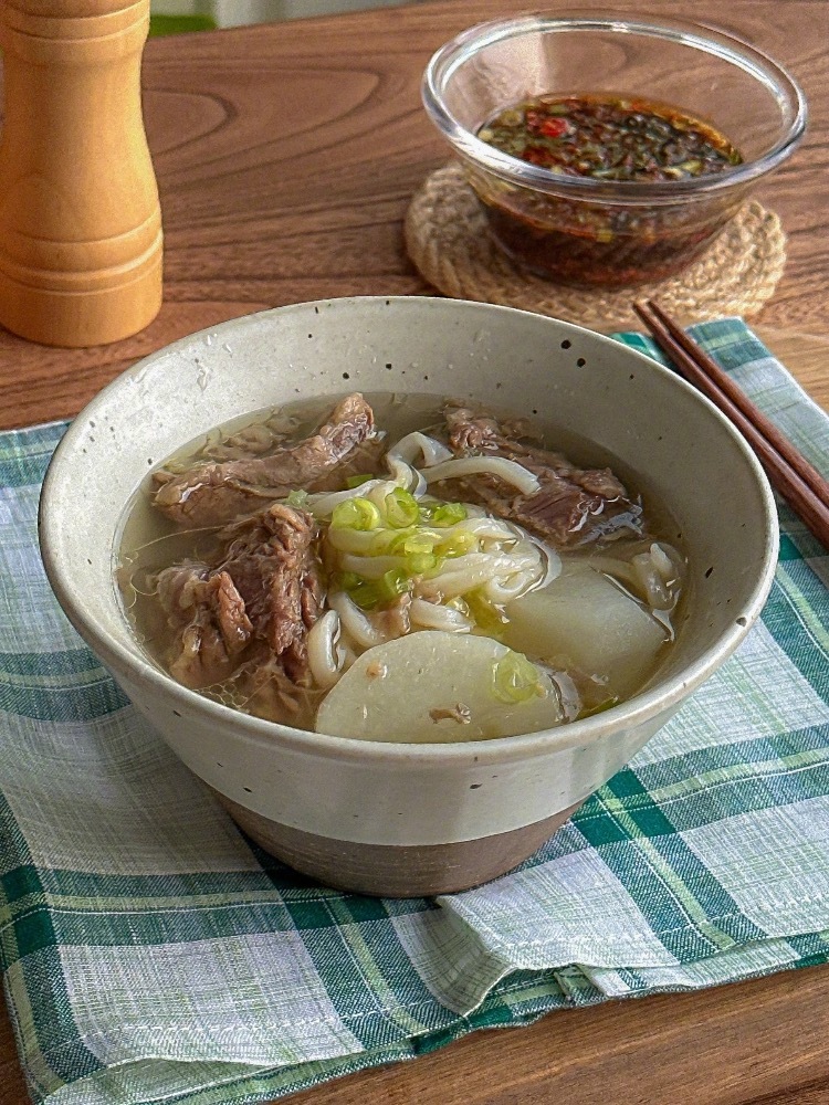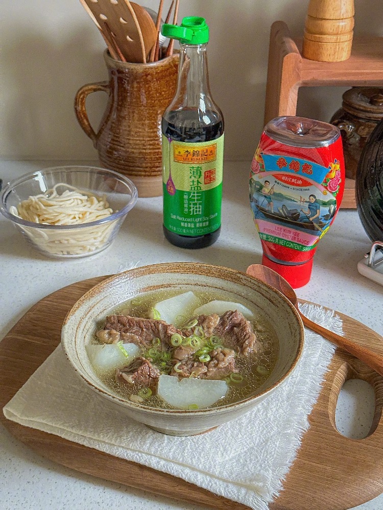 一碗清淡却不失鲜味的萝卜牛肋条汤牛肉的温补加上萝卜的清润,喝完整个人都会被润得暖乎乎的!萝卜吸饱了汤汁,糯糯的口感吃起来比肉还过瘾
