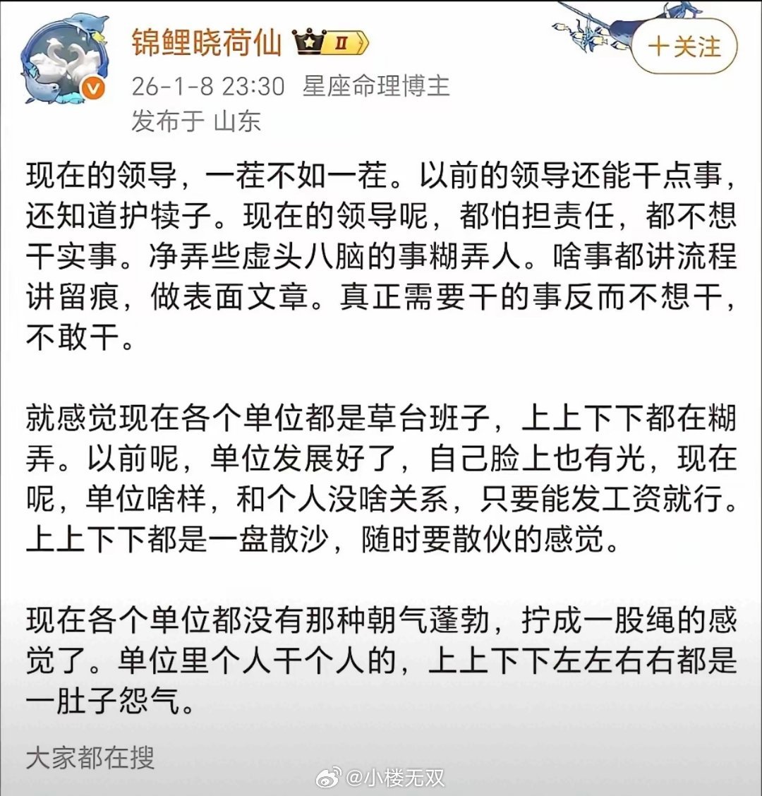 网友吐槽以前的领导还能干点事,现在的领导只知道护犊子,做事讲流程、留痕,做表面文章。就像草台班子,随时都要散伙的感觉。