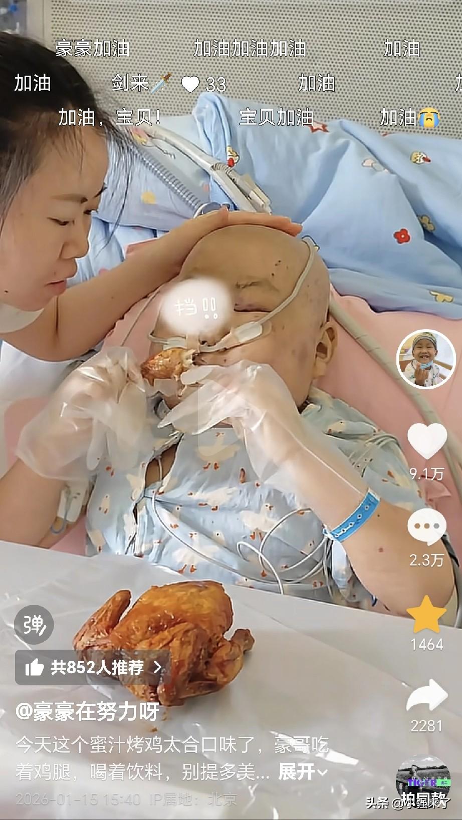 1月15号,妈妈给10岁白血病儿子“豪豪”买来了蜜汁烤鸡和饮料,其实这种不健康的东西,并不适合病人吃,但除非有一种特殊情况,那就是医生告诉说:时日不多,尽量满足一下爱好吧。 没错,“豪豪”的病情恶化了,出血点也越来越多,之前预测挺不过元旦,但靠着坚强的毅力,竟然过来了,可能不能到春节,一切都是未知数。 通过视频看出,嘴唇干裂没有血色,这是骨髓不再造血了,其实这时候吃东西味觉已经受了很大影响,感觉不出多美味,但是依然用“狼吞虎咽”去安慰妈妈,这是一种双向奔赴,我相信上天会留住孩子[流泪][流泪][流泪]。
