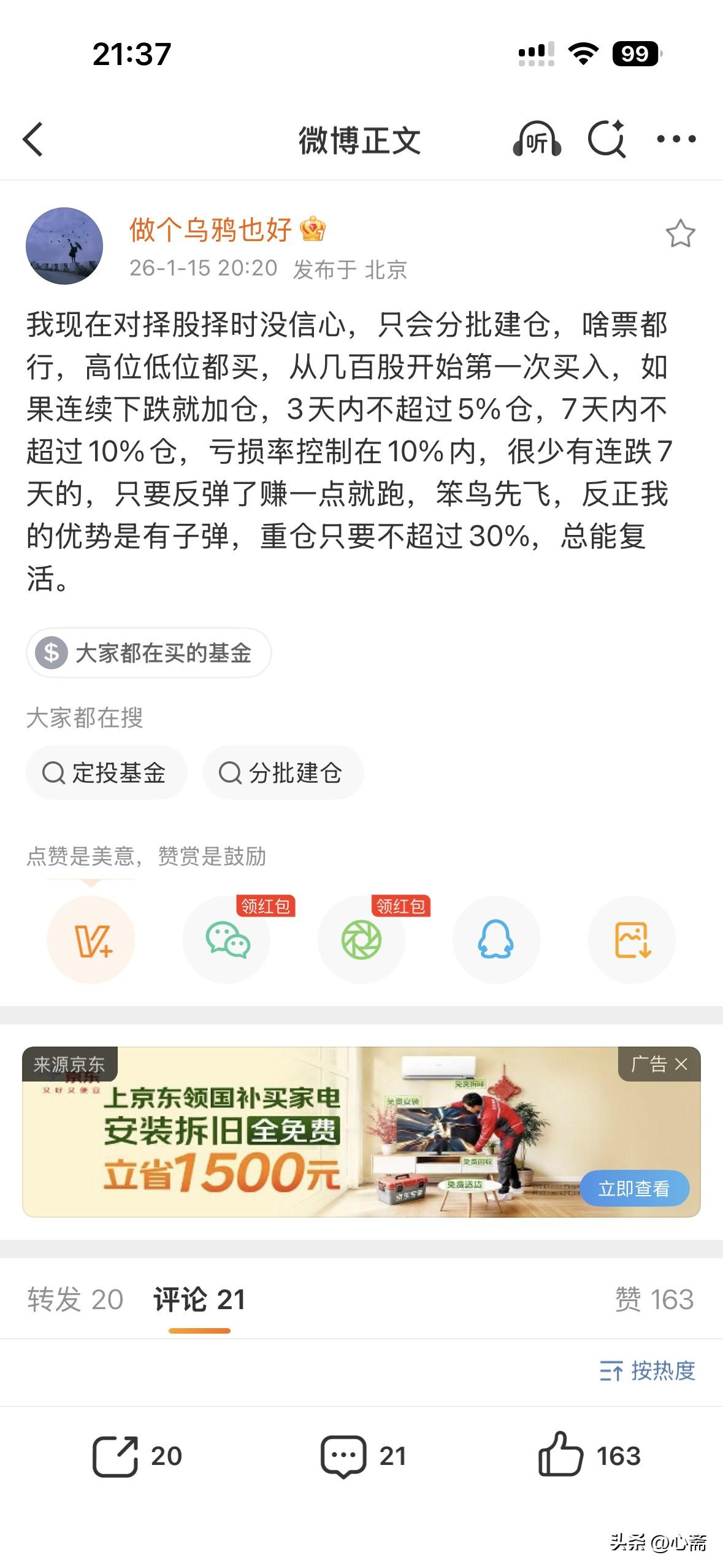 木子美亲授炒股秘籍,小批量建仓,亏损就加,仓位控制在10%以内,亏损率也控制在10%以内,反弹赚了就跑。美其名曰笨鸟先飞,反正姐有的是子弹。 哪里笨呀? 市场只有一个笨笨,被田小姐领走了[偷笑][偷笑][偷笑]