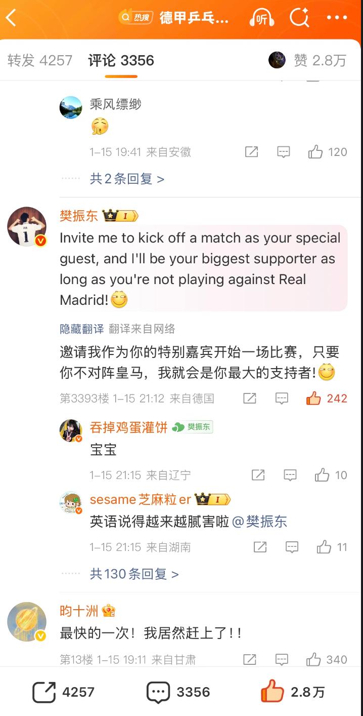 樊振东评论多特蒙德—皇马依旧是心头肉啊! 1月15日, 樊振东评论多特蒙德足球俱乐部 “邀请我作为你的特邀嘉宾开始一场比赛,只要你不对战皇马, 我就会是你最大的支持者!” 皇马的冠军运已经被繁星献祭了, 不知道东哥知道同不同意? 樊振东真有礼貌, 评论区回答最后一个问题! 原因是多特蒙德送给东哥一件球衣, 并问樊振东会不会换下皇马球衣, 穿上多特蒙德的球衣看比赛? 这个问题樊振东很难回答, 只用哈哈哈大笑蒙混过关! 东哥的皇马周一输巴萨, 丢了西超杯, 今天又输了西乙, 丢了国王杯, 樊振东的心里一定很苦…… 但是不得不承认樊振东的 英语水平增长速度加快!