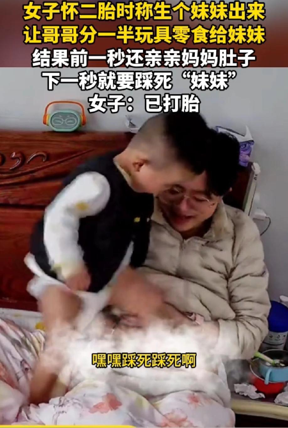 感觉有点恐怖!小孩说踩死,家长不好好教育小孩,居然直接把二胎打了。感觉这妈妈思想有问题啊! 还穿着尿布湿的小孩,哪里懂踩死是什么意思?小孩踩妈妈肚子,妈妈嘴上虽然说着不要踩,但是阻拦的动作都没有。虽然有点痛,但是妈妈全程在笑,宠溺的眼神看着小孩。 生二胎就生二胎,说什么让哥哥分一半玩具零食给妹妹。这个年龄,哪里懂分享?这是直接给引导小孩对立! 应该就是妈妈自己不想生,故意让小孩背锅!一说起来,就是小孩不想要妹妹,所以才选择打掉。 幸好妹妹没来到这个世界上,这种妈妈太可怕了!