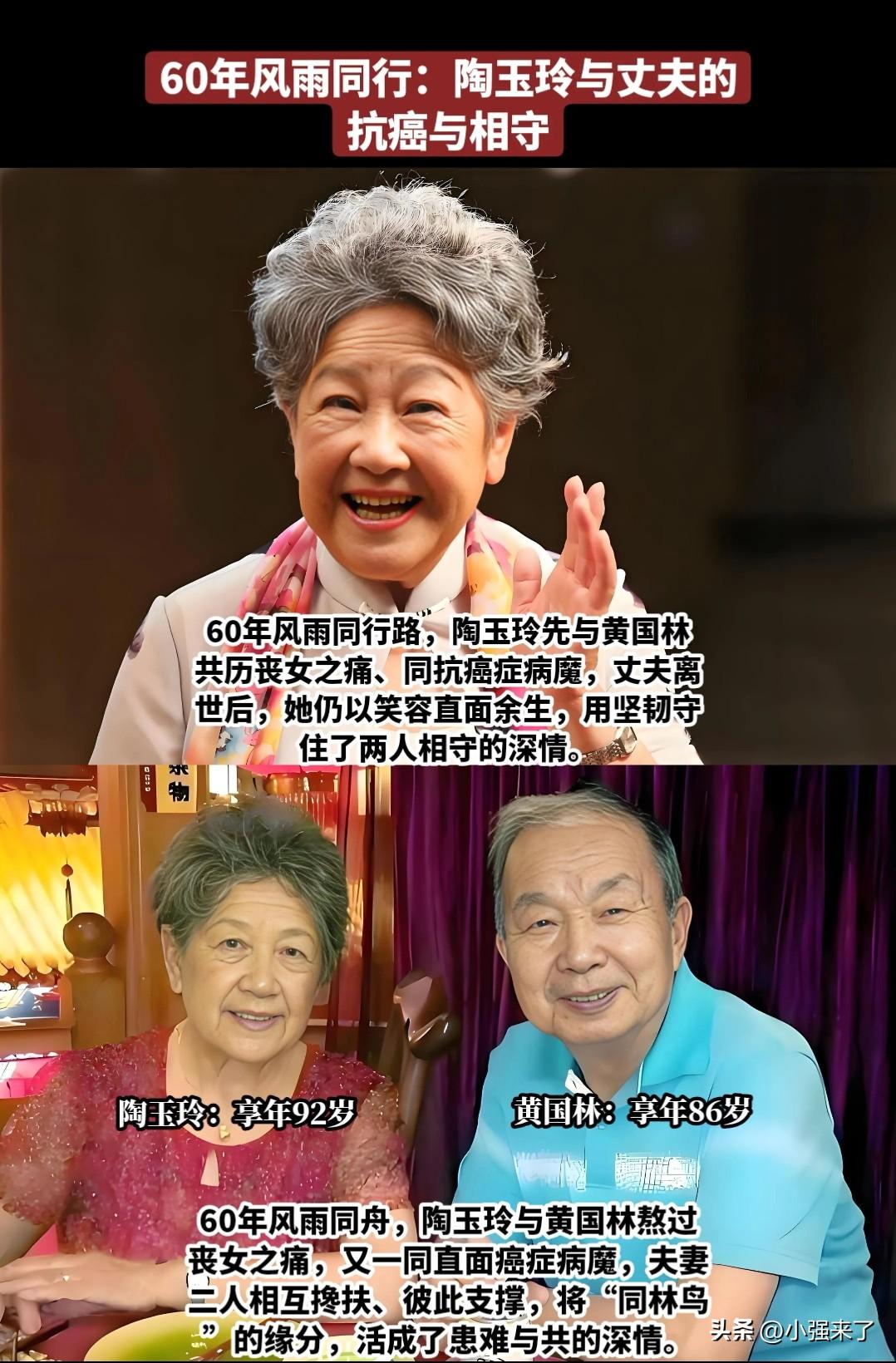 2017年,黄国林去世了,享年86岁。2026年,陶玉玲去世了,享年92岁,两人携手近60年,仔细一看,还真是有夫妻相,都是:眉毛弯弯,耳垂又大又厚,鼻若悬胆,椭圆形脸,笑起来很慈祥,虽然没接触过本人,想必在生活中也是平易近人吧。著名心理咨询师,周小鹏女士曾经说过,夫妻相就是最高级的恩爱,因为他愿意为你改变,她愿意为你改变,逐渐感情越来越好。九泉之下再次团聚了,一路走好[祈祷][祈祷][祈祷]。