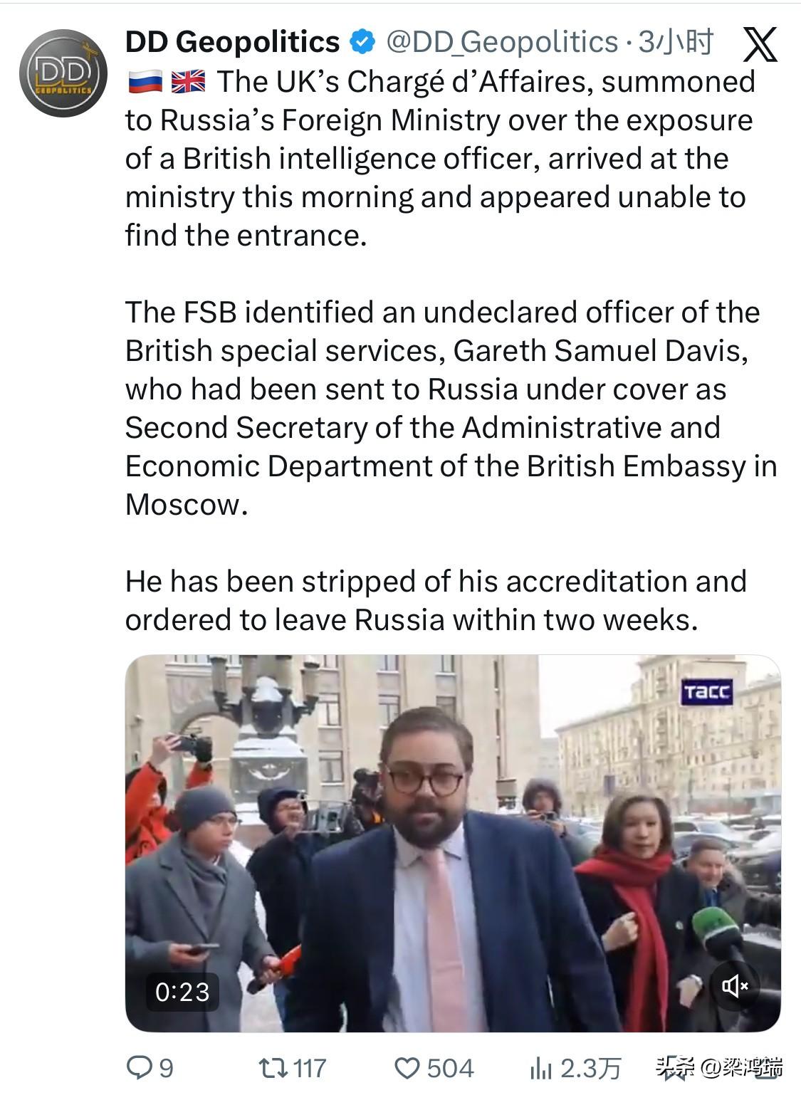 英国驻俄罗斯临时代办因一名英国情报官员被曝光而被召至俄罗斯外交部,他今天早上抵达外交部,但似乎找不到入口。 俄罗斯联邦安全局确认了一名未申报的英国特勤部门官员加雷斯·塞缪尔·戴维斯,他被派往俄罗斯,担任英国驻莫斯科大使馆行政经济部二等秘书。 他已被剥夺记者证,并被勒令两周内离开俄罗斯。