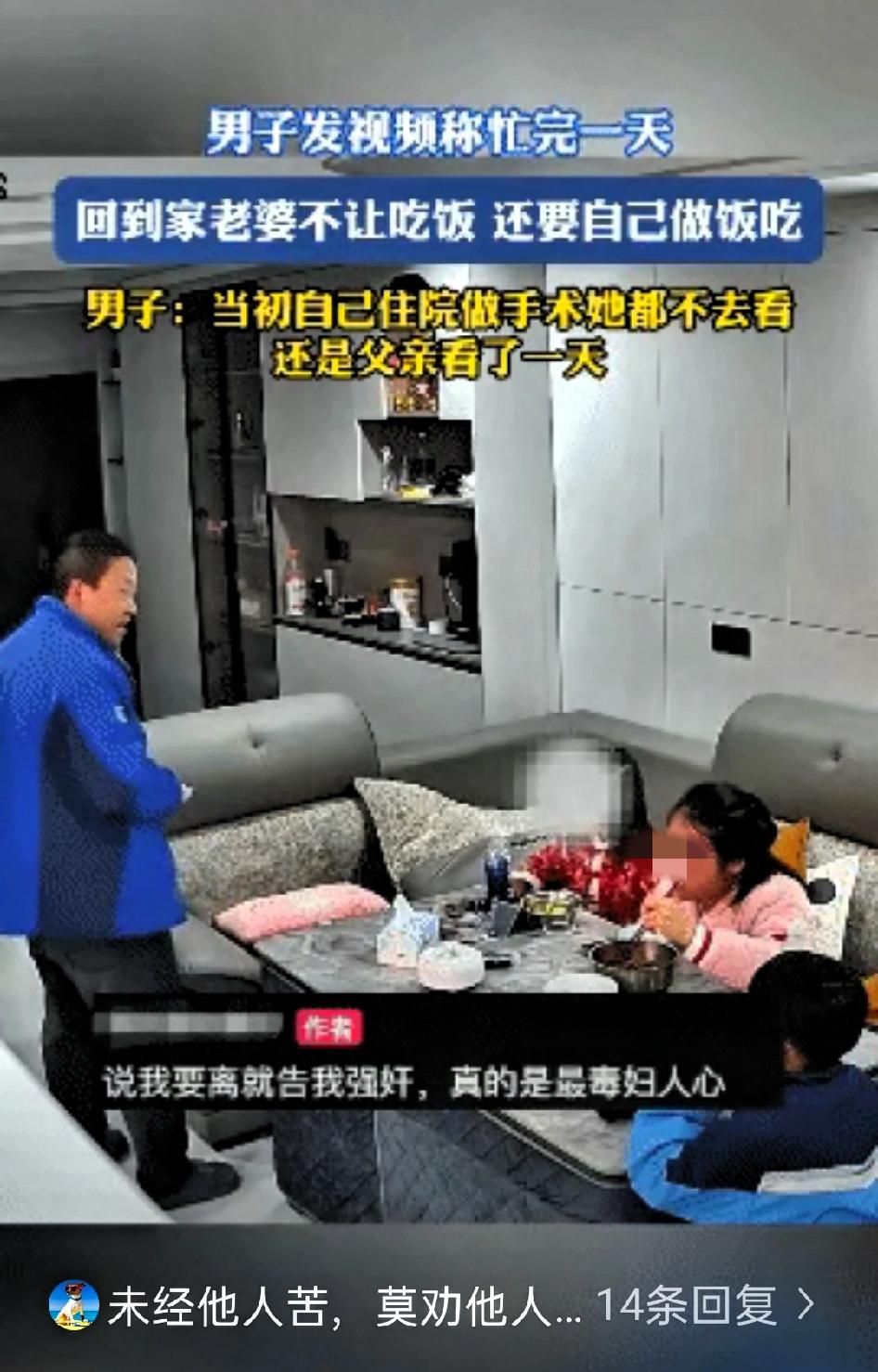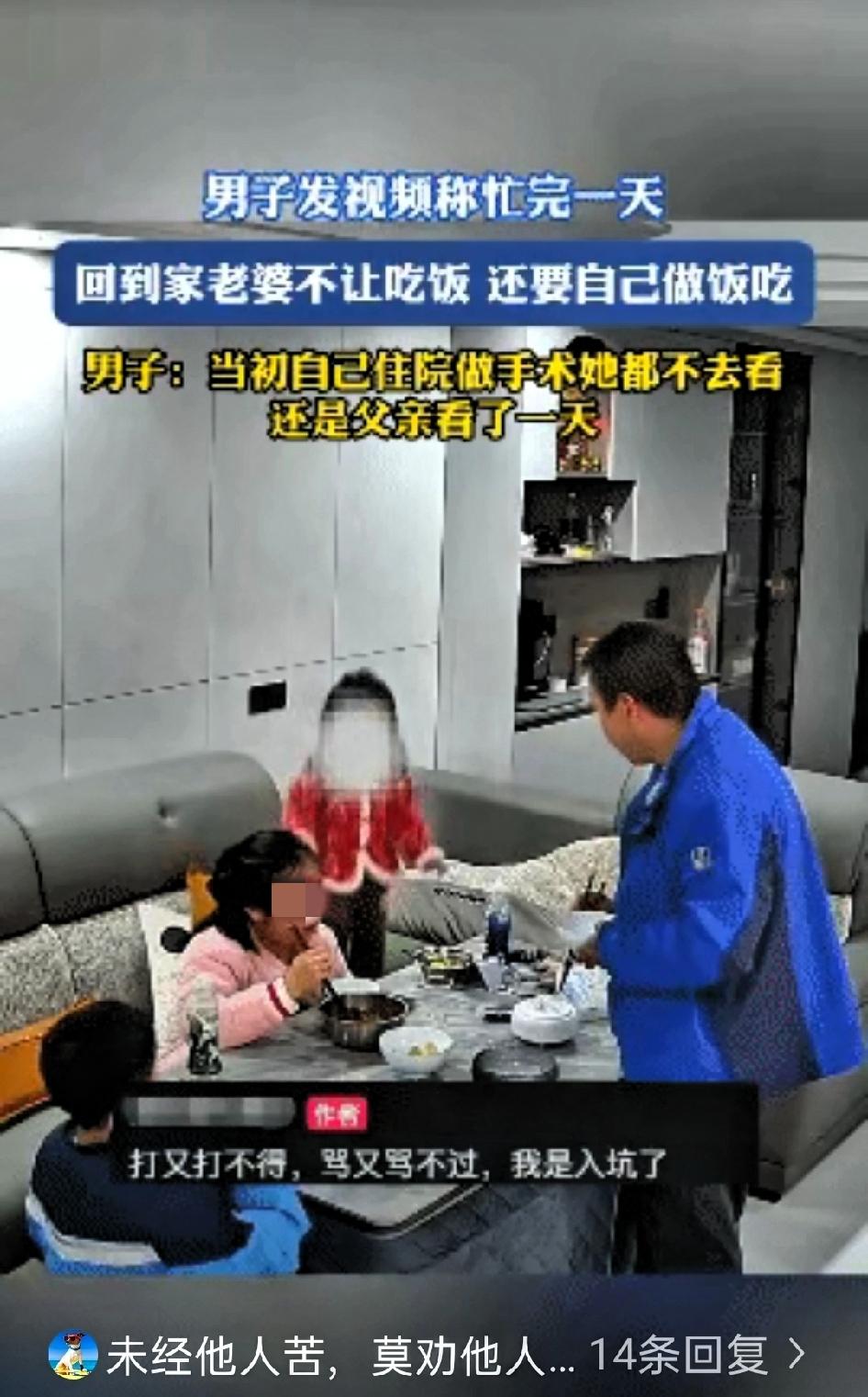 夫妻过成这样还有啥意思。 ​1月14号,湖南,一男子下班回家,老婆孩子已经开饭,没等自己确实有点失落,但男子没计较,自己盛饭想凑一起吃,却被老婆直接发飙制止,连孩子都被吓得一愣。 这哪是一顿饭的矛盾,分明是攒了太久的冷遇。男子说这种状况不是一天两天,更让人揪心的是,他住院做手术的时候,妻子没去医院看过一眼,最后还是年迈的老父亲赶来照顾了他一晚。 夫妻做到这份上,真的还不如普通朋友。朋友尚且会在你落难时伸把手,可枕边人却能做到冷眼旁观。 很多人说,为了孩子不能离婚,可这样冷冰冰的家,对孩子来说真的是好归宿吗?孩子天天看着父母互相排斥、话不投机就吵架,心里只会充满不安和惶恐。比起一个完整却没温度的家,孩子更需要的是父母和睦、氛围轻松的成长环境。 婚姻的意义,从来不是搭伙过日子,而是互相扶持、彼此心疼。当两个人连最基本的关心都没有了,守着这个空壳婚姻,不过是两个人的内耗,还连累孩子跟着受罪。 别再拿孩子当借口硬扛了,一段没有温暖的婚姻,耗着的是三个人的人生。与其在煎熬里互相折磨,不如好好想想,这样的日子到底值不值得。