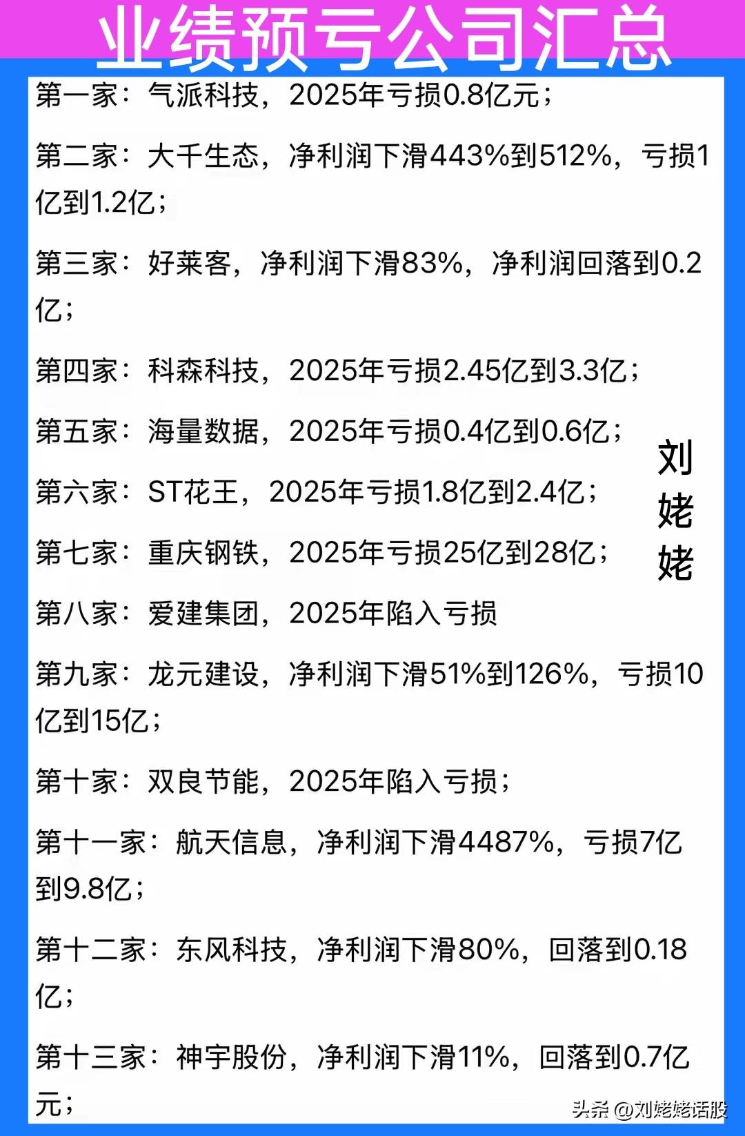 昨夜【15号晚】“业绩预亏”公司汇总 关注“刘姥姥”,精彩分享真不少(麻烦亲们:点赞,收藏,分享)。 特别提醒:本文涉及内。容及个股,仅供交流与参考,不是荐股,不得以此作为买卖依据,盈亏自负。股市业绩预告