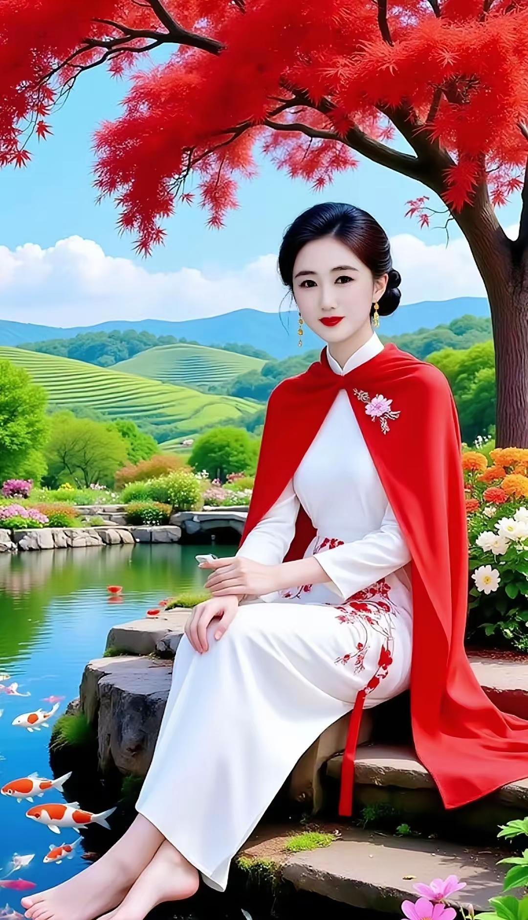 红衣美人倚树坐,山水画卷美如画。