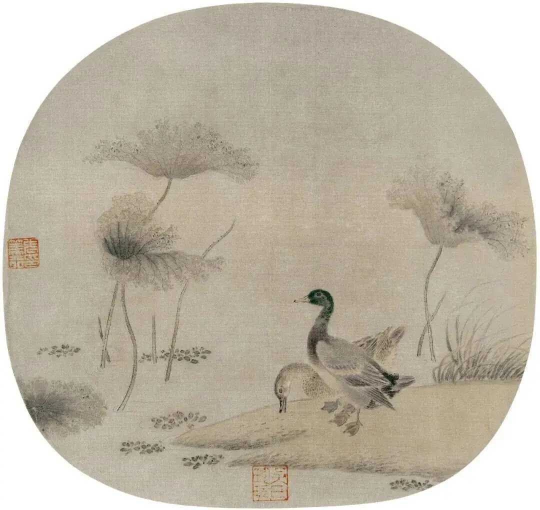 宋 佚名《秋渚文禽图》。枯荷的焦墨线条像老僧的禅杖,麻鸭的动态又带着市井烟火气。这就是中国风遇见艺术