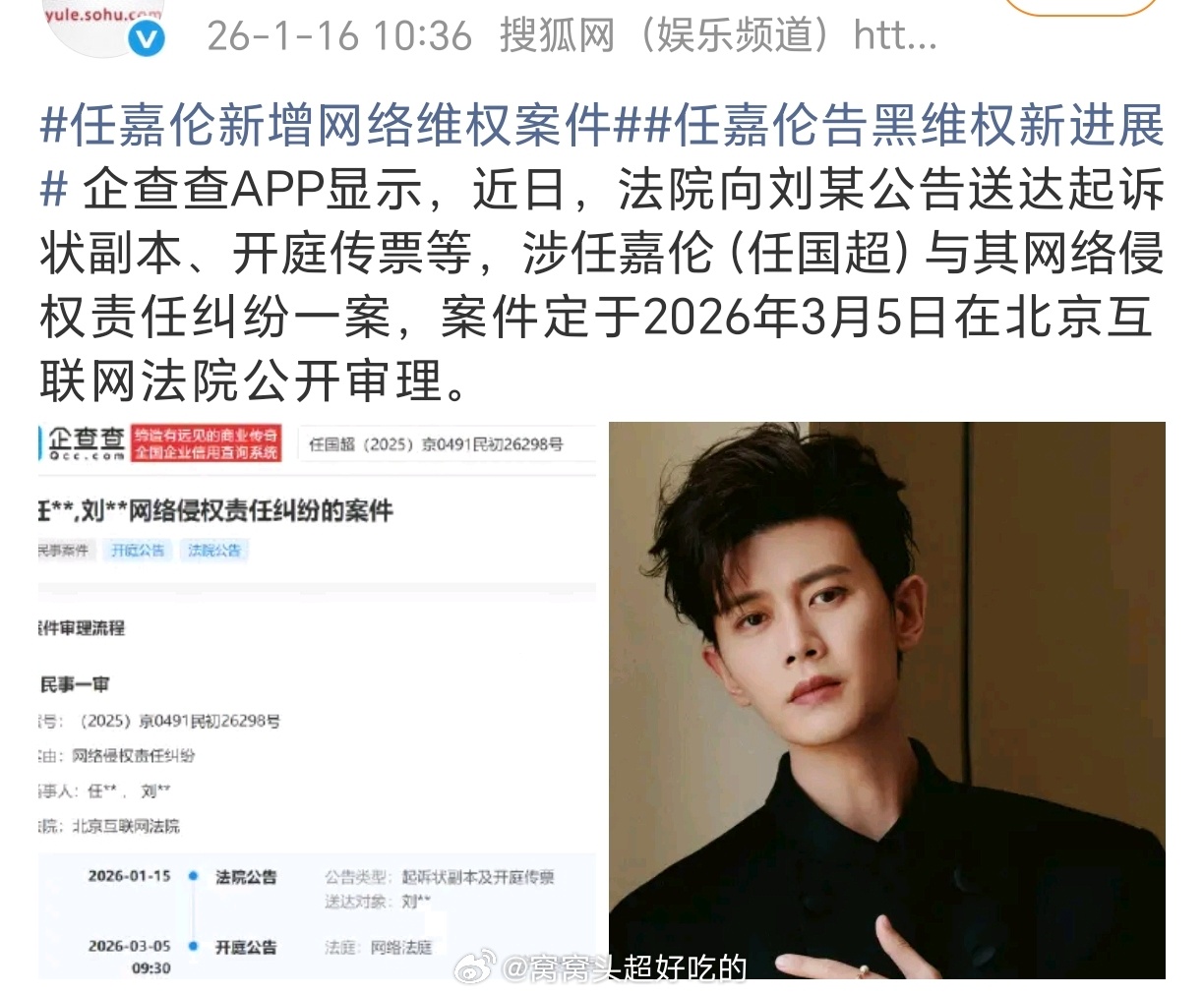 任嘉伦告黑维权新进展任嘉伦黑粉被告开庭+1,支持任嘉伦先生依法维权!网络不是法外