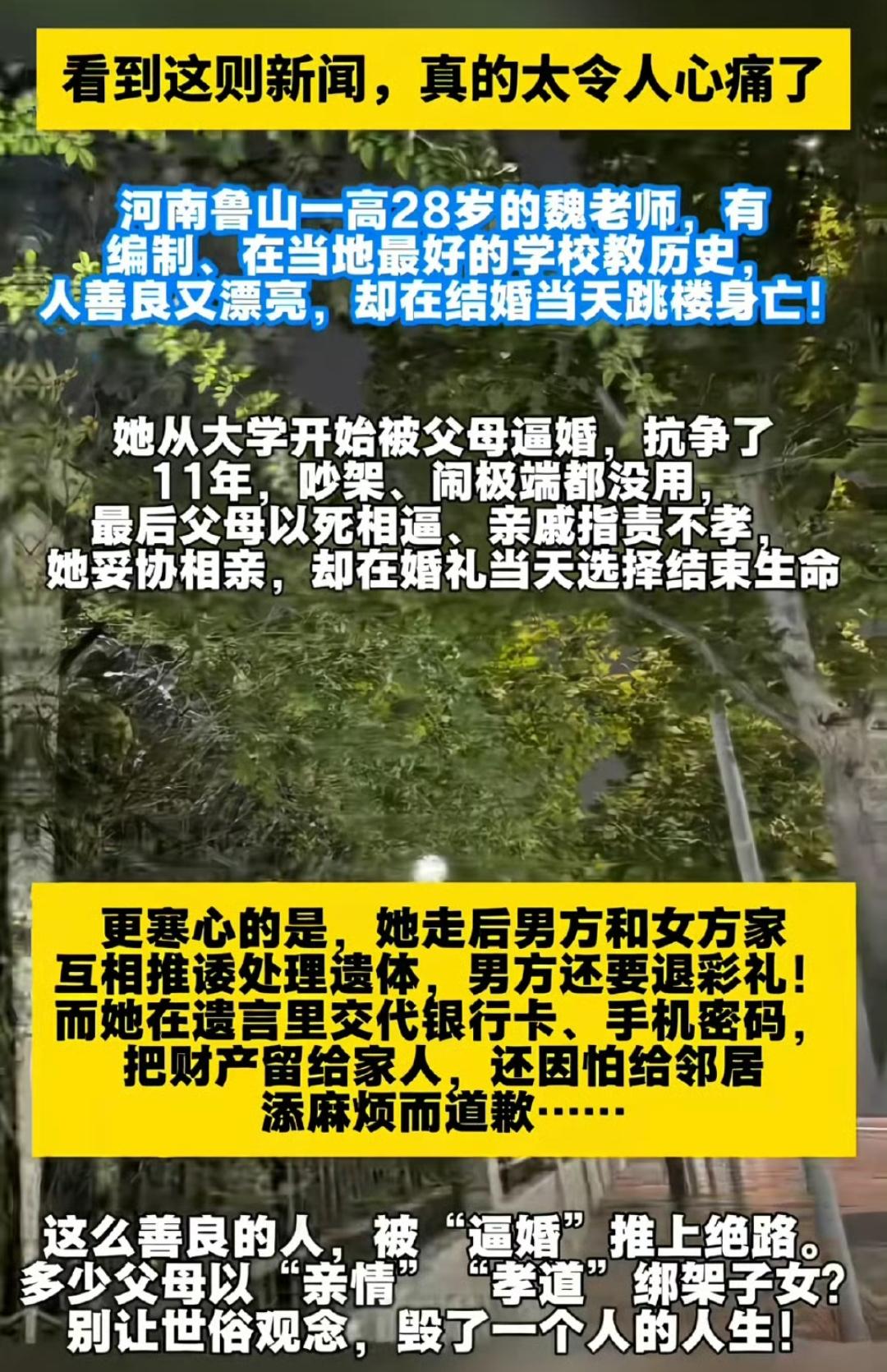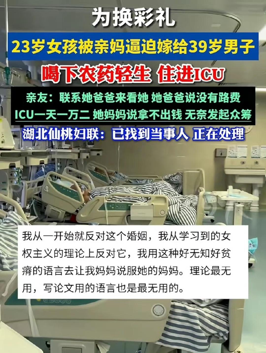 被逼婚喝农药女子相亲数日领证,同是反抗逼婚悲剧何时休[流泪][流泪]? 婚姻不是交易,“知根知底”不能成为逼迫的借口,“为你好”更不该成为伤人的利刃[恐惧][恐惧]。 湖北仙桃23岁女子谢某某的遭遇令人揪心:相亲仅数日便被母亲催促领证,因抗拒嫁给大15岁的远亲,绝望喝下农药敌草快,至今仍在ICU与死神搏斗,后续治疗需20万元救命钱。 一边是表姐爆料她打工攒下的积蓄被母亲拿走,遭拉黑逼婚;一边是母亲辩称“不要彩礼只为她好”,如今愿同意离婚。 这让人想起此前结婚当天跳楼的女教师,两场悲剧背后,都是女性婚姻自由被裹挟的无奈。女孩自幼由外婆抚养,本应拥有自主人生,却沦为长辈眼中“该成家”的工具。 在婚恋自由早已入法的今天,为何仍有女性要以生命为代价反抗逼婚?值得全社会深思。逼婚 逼婚经历