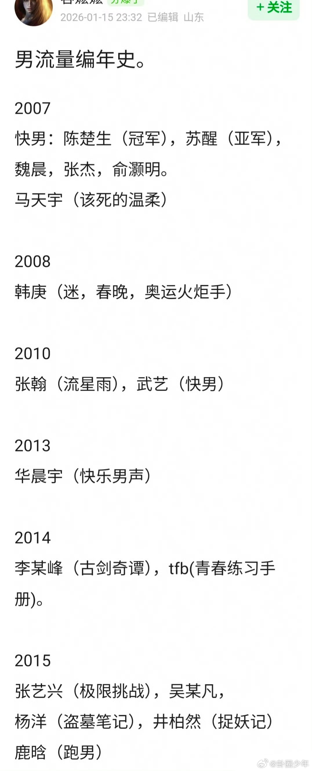 男流量的编年史 编年史的核心价值在于梳理脉络而非绝对定义。2014年“归国四子”与《古剑奇谭》开启流量元年,2018年后耽改、选秀拓宽造星路径,2021年清朗行动重塑行业规则,每个节点都有标志性事件与人物,但其划分边界本就存在弹性,无需执着于唯一答案。