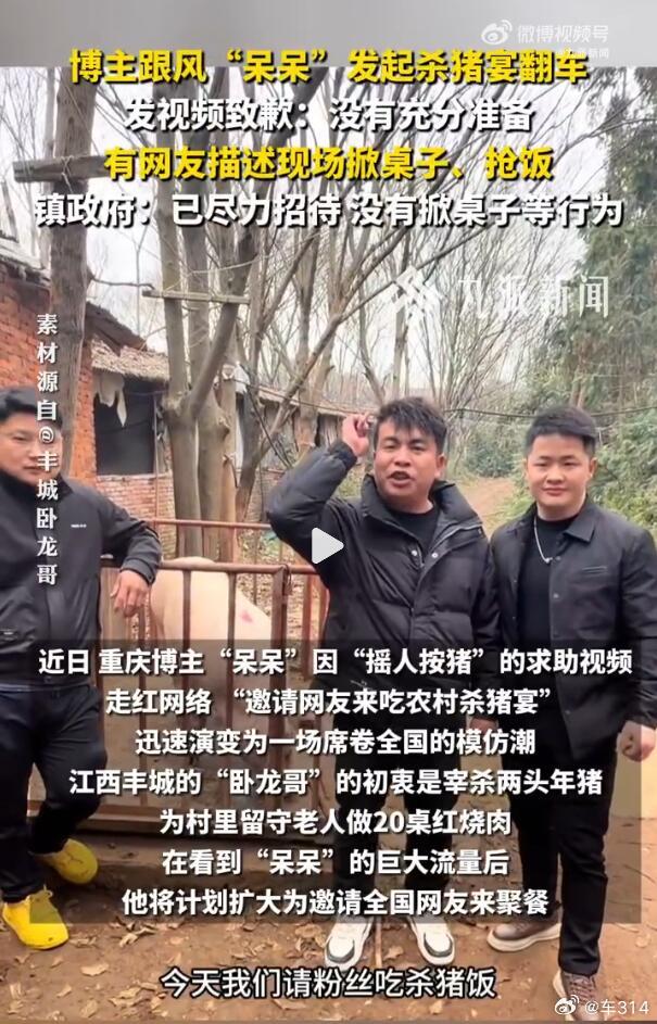 重庆的事情火了,全国很多地方都在跟风“杀猪宴”,但也得看当地的风土人文,我可是见识过农村的那些老头老太的,在流水席上人家可不管你什么公序良俗,直接就拿手抓,刚上来的饭菜就拼命抓到自己盘子里,有的甚至自己带塑料袋,统统装走。那个架势,城里人看了估计要震惊一整天的。说句不该说的:“穷山恶水出X民”,这话还是有点道理的…..江西杀猪宴跟风呆呆翻车发起江西杀猪宴翻车博主道歉当地否认江西杀猪宴抢饭掀桌子