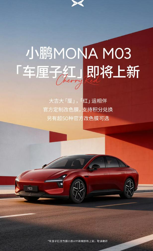 小鹏MONA官方改色车厘子红即将上线,支持积分兑换,用的是质量不错的改色膜,贴合度更好,左下角说了图片是AI生成,实物要是能做到这个效果就太棒了,不喜欢红色也没事,官方还有超50种改色膜和可选,新年给爱车换个新颜色,图个喜庆~【来自懂车帝车友圈】