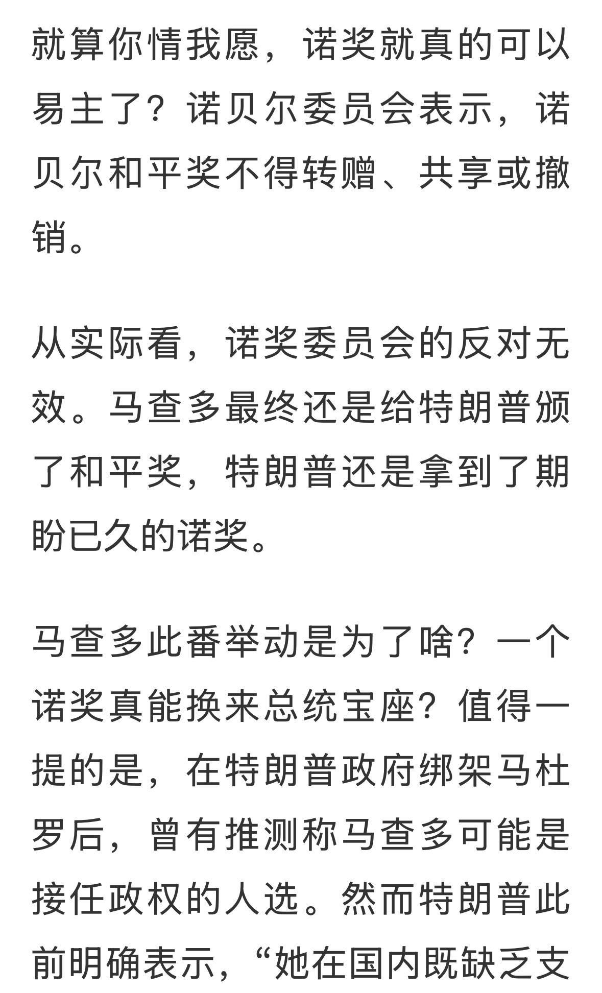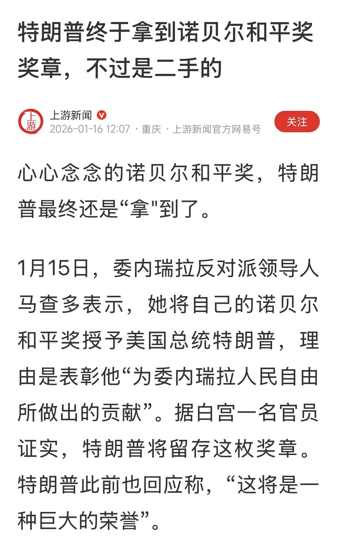 两败俱伤,川普拿到的只能说是一个假奖章, 它要想要,可以从义乌达几百个过去给他。马查多拱手相让,证明自己不配这个荣誉,只能说他是个投机份子,