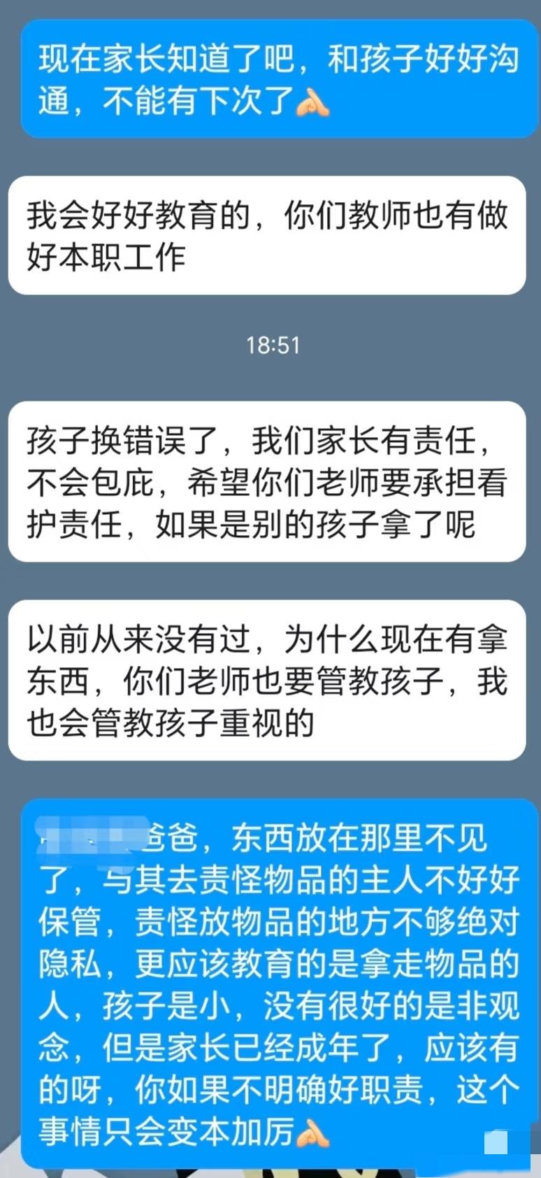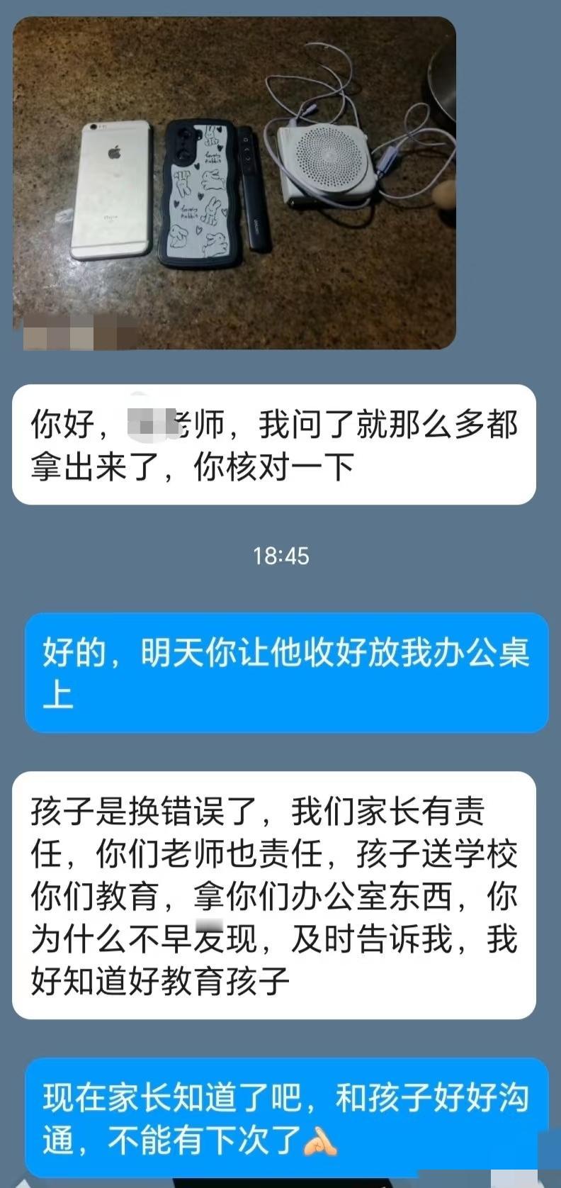 现在当个老师太难了! 学生偷东西,家长却怨老师没教好 一定要让老师认错认责任 事情是这样的:一个学生拿了老师办公室的手机和一些东西,老师跟家长反映了这个事情,让学生第二天把那个的东西还回来 本来也不是什么大事,第二天把拿的东西还过去就算了 但家长非要说老师的错误,因为老师没有管教好,而且把这些手机放办公室就是在引诱学生犯错 果然这句话说的没错:如果发现一个孩子有问题,最后会发现他其实是家里病的最轻的哪一个 大家觉得呢? 老师遭投诉 家长质问老师