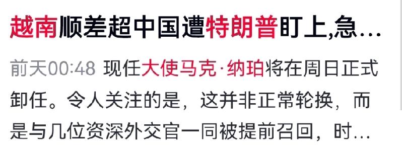 驻越大使突换人,特朗普的“生意算盘”打得响! 美驻越南大使马克·纳珀被召回,继任者是军人出身、外交经验丰富的麦克纳马拉。外界预期她态度将更加强硬。 为何换人?特朗普嫌纳珀在越南“没谈出足够好处”。数据显示,2025年越南对美贸易顺差已接近1340亿美元,成为美国最大顺差来源国。在美国加税背景下,这一数字令特朗普政府难以接受。 麦克纳马拉在听证会上已放话:必须整顿美越贸易。接下来,美国很可能推动重谈贸易协定,施压越南提高关税、扩大进口美国商品。 然而,美国是越南最大出口市场,越南会轻易让步吗?这场以“生意”为核心的外交博弈,刚刚拉开序幕。 对此你怎么看?