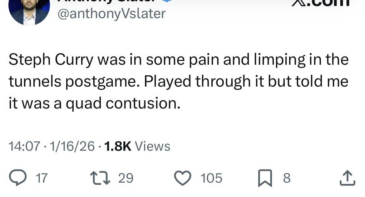 斯蒂芬·库里赛后在球员通道里表现得有些痛苦,并且走路一瘸一拐。虽然他是带伤打完了比赛,但他告诉我那是股四头肌挫伤。