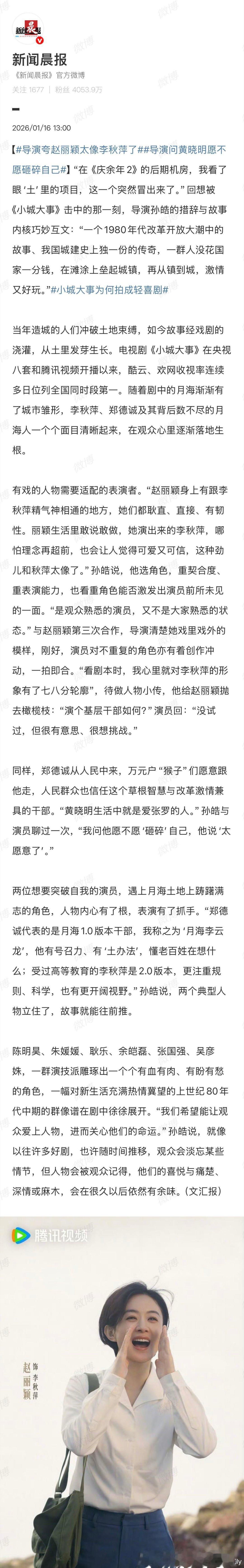 导演夸赵丽颖太像李秋萍了 导演孙皓直言赵丽颖的耿直、有韧性和李秋萍精气神相通,这份高度契合太绝了~确实,李秋萍就是一位有远见、敢突破的基层干部,今晚《小城大事》继续追,看李秋萍在造城路上再破新局!