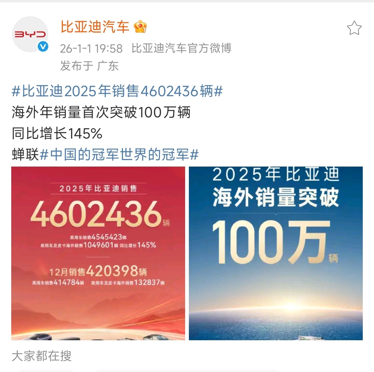 恭喜比亚迪!2025年销售突破460万辆,其中海外销量突破100万辆!比亚迪