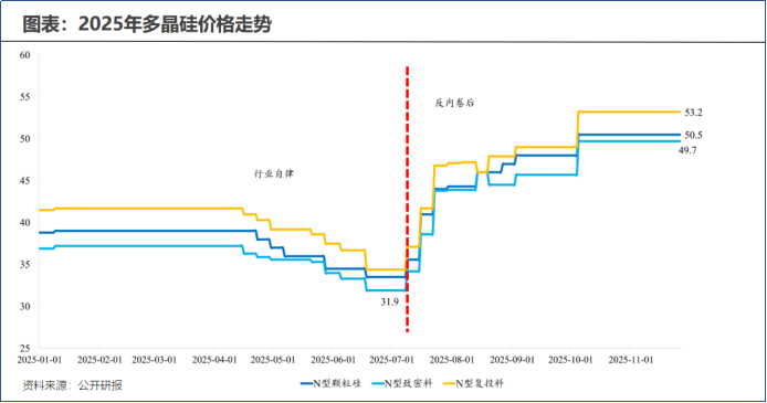 一方面多晶硅价格提升。2025年7月份,N型致密料价格还跌破3.2万元/吨,击破行业现金成本线,加速行业内产能出清。